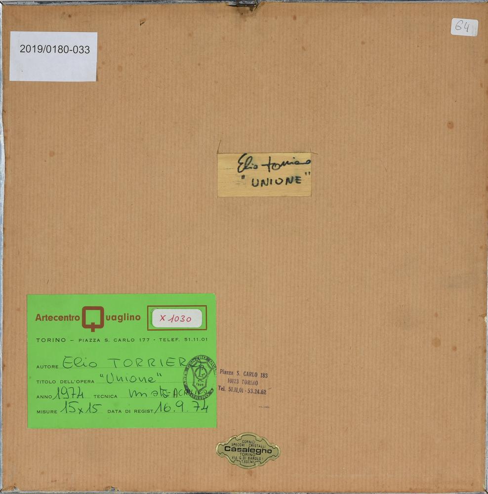 Elio Torriero UNIONE tecnica mista su tavola, cm 15x15 sul fronte: firma sul retro: firma e titolo eseguita nel 1974