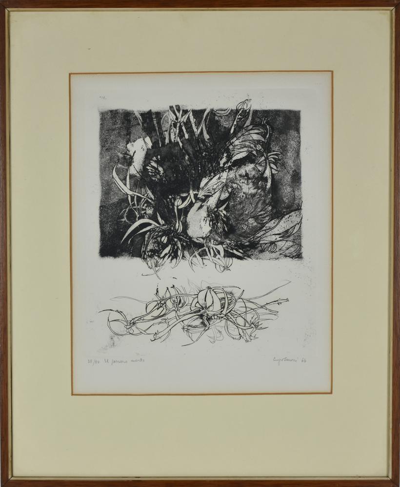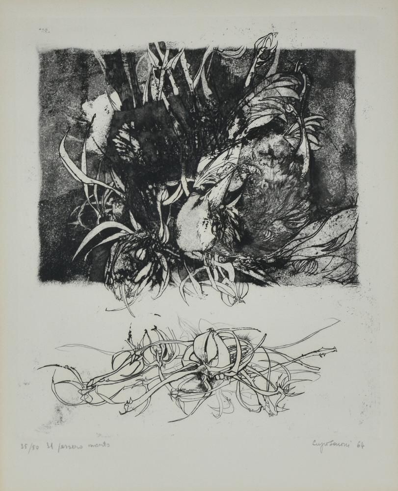 Sergio Saroni IL PASSERO MORTO acquaforte su carta, cm 54x44 (lastra cm 31x26) esemplare 35 su 50 sul fronte: firma, titolo e data eseguita nel 1964