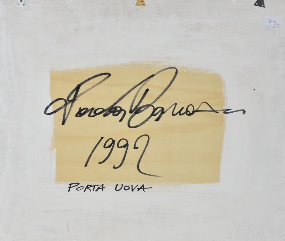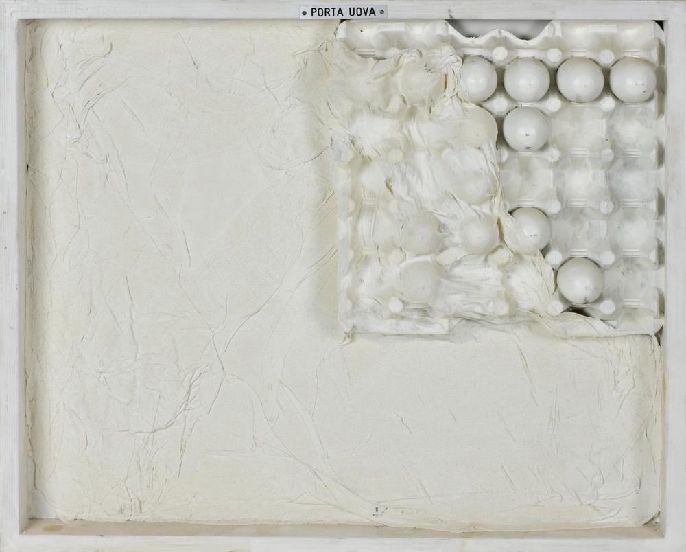Ignoto PORTA UOVA tecnica mista, collage e applicazione su tavola, cm 54x64x6 sul fronte: titolo sul retro: firma, titolo e data eseguito nel 1992