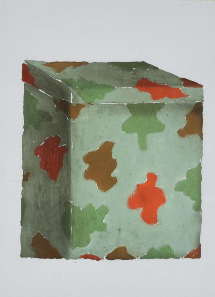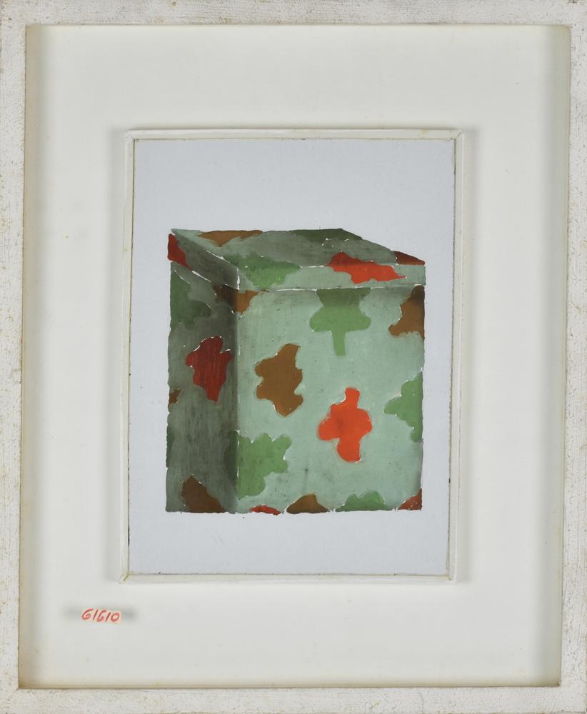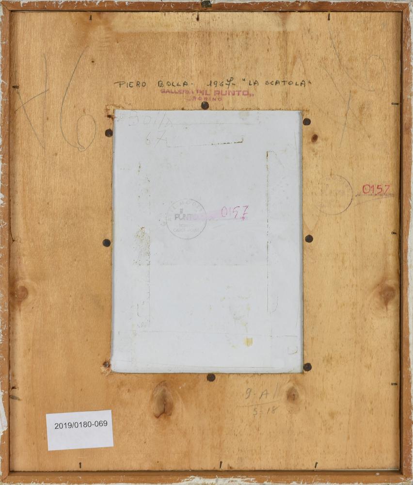 Piero Bolla LA SCATOLA tecnica mista su tavola, cm 24x19 sul retro: firma, titolo, data e timbro della Galleria d'Arte Moderna Il Punto, Torino eseguita nel 1967