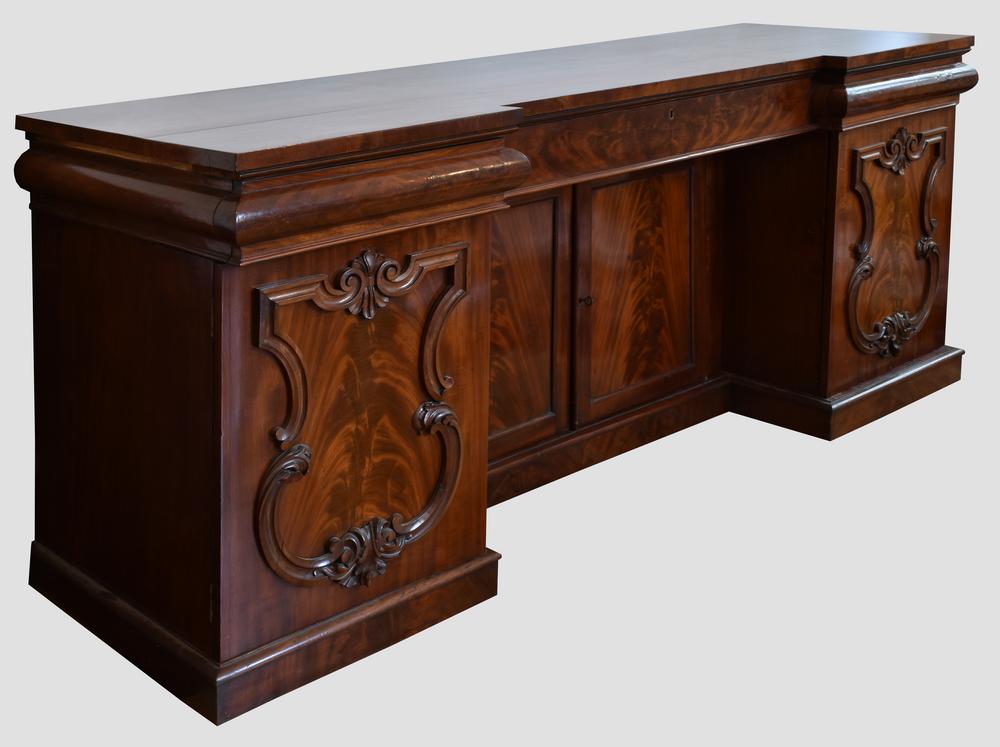 CREDENZA VITTORIANA Credenza lastronata in piuma di mogano con 4 ante e 3...