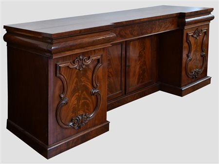CREDENZA VITTORIANA Credenza lastronata in piuma di mogano con 4 ante e 3 cassetti Inghilterra, inizio XX secolo cm 68x218x98 Lievi difetti e mancanze