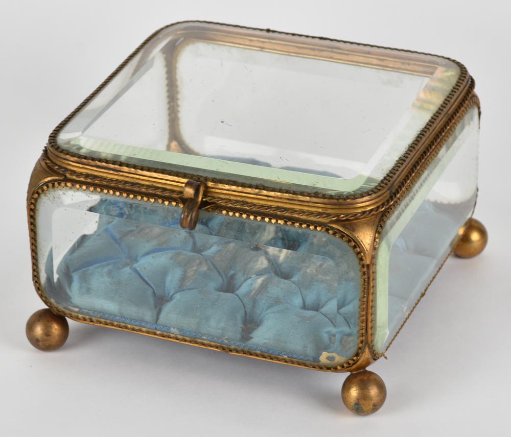 SCATOLA PORTAGIOIE Scatola portagioie in metallo dorato e cristalli molati Italia, inizi XX secolo cm 10x18x18 Difetti e rotture