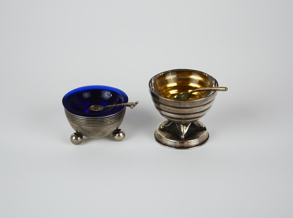 Saliera in argento e cristallo a coppetta scanalata su tre piedi con base circolare Saliera in argento e vetro blu a emisfera e tre piedi sferici Complete di cucchiaini g 90