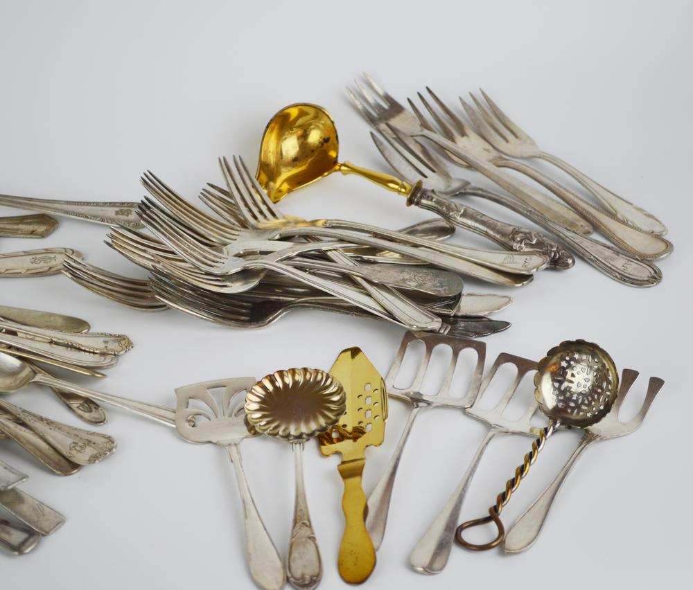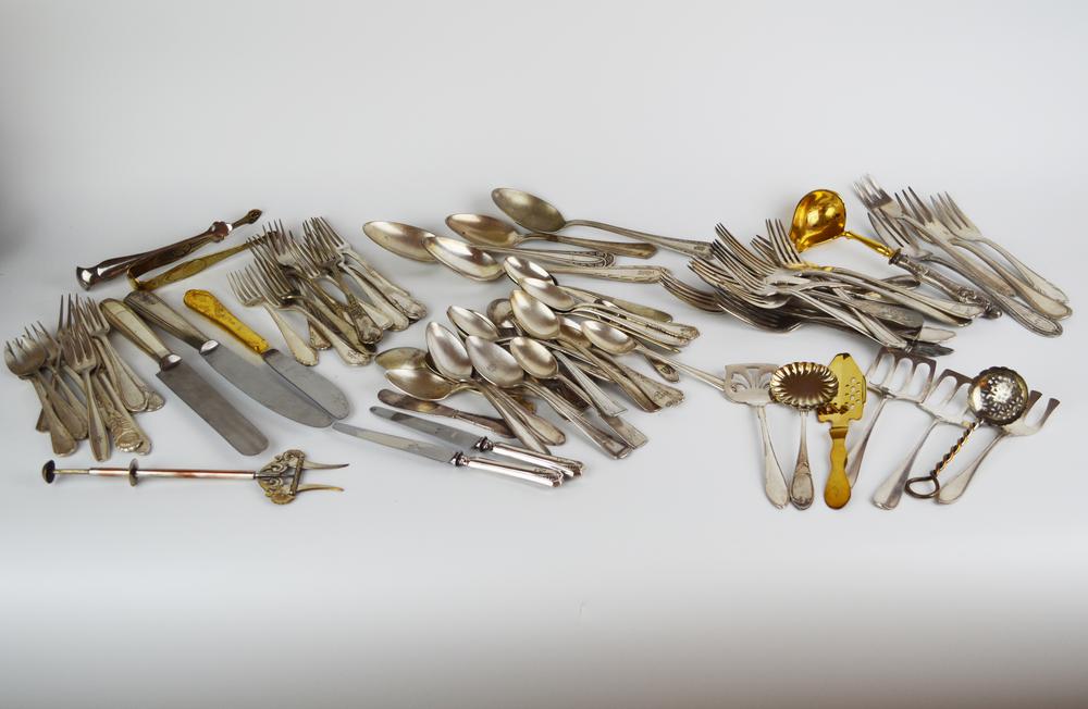 Lotto composto da 84 posatein metallo argentato: 14 forchette grandi 4 cucchiai grandi 3 coltelli grandi 22 cucchiaini 4 forchette da pesce 11 forchette da frutta 12 forchette da dolce 1 coltello da burro 2 pinze da zucchero 1 romaiolo da salsiera 7 cucchiai da ciliege sottospirito 1 forchettone 2 coltellini Il lotto è composto da posate di modelli differenti