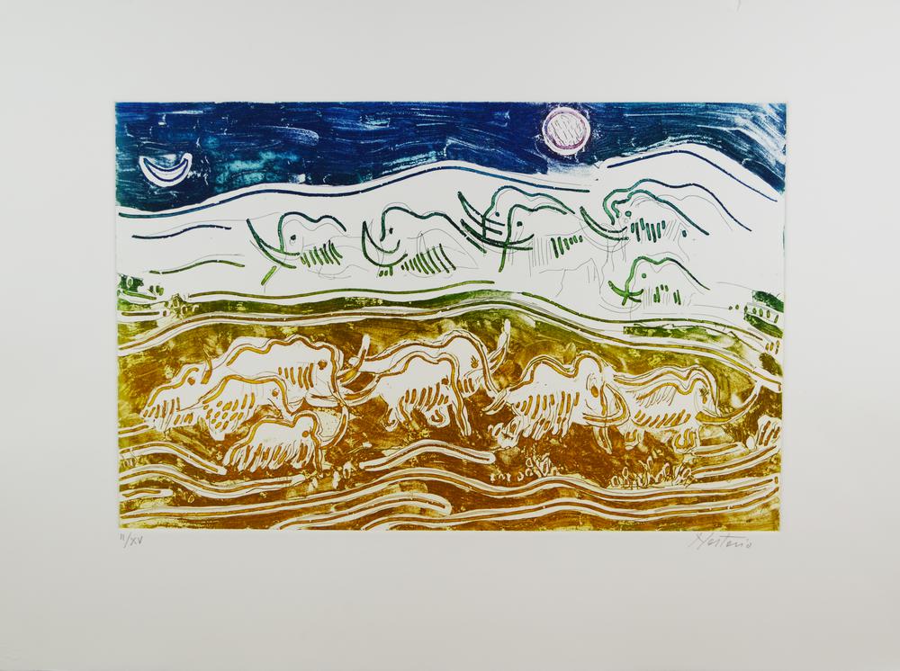 V) Senza titolo. Acquatinta e acquaforte a colori. mm 315x490. Foglio: mm 500x690.