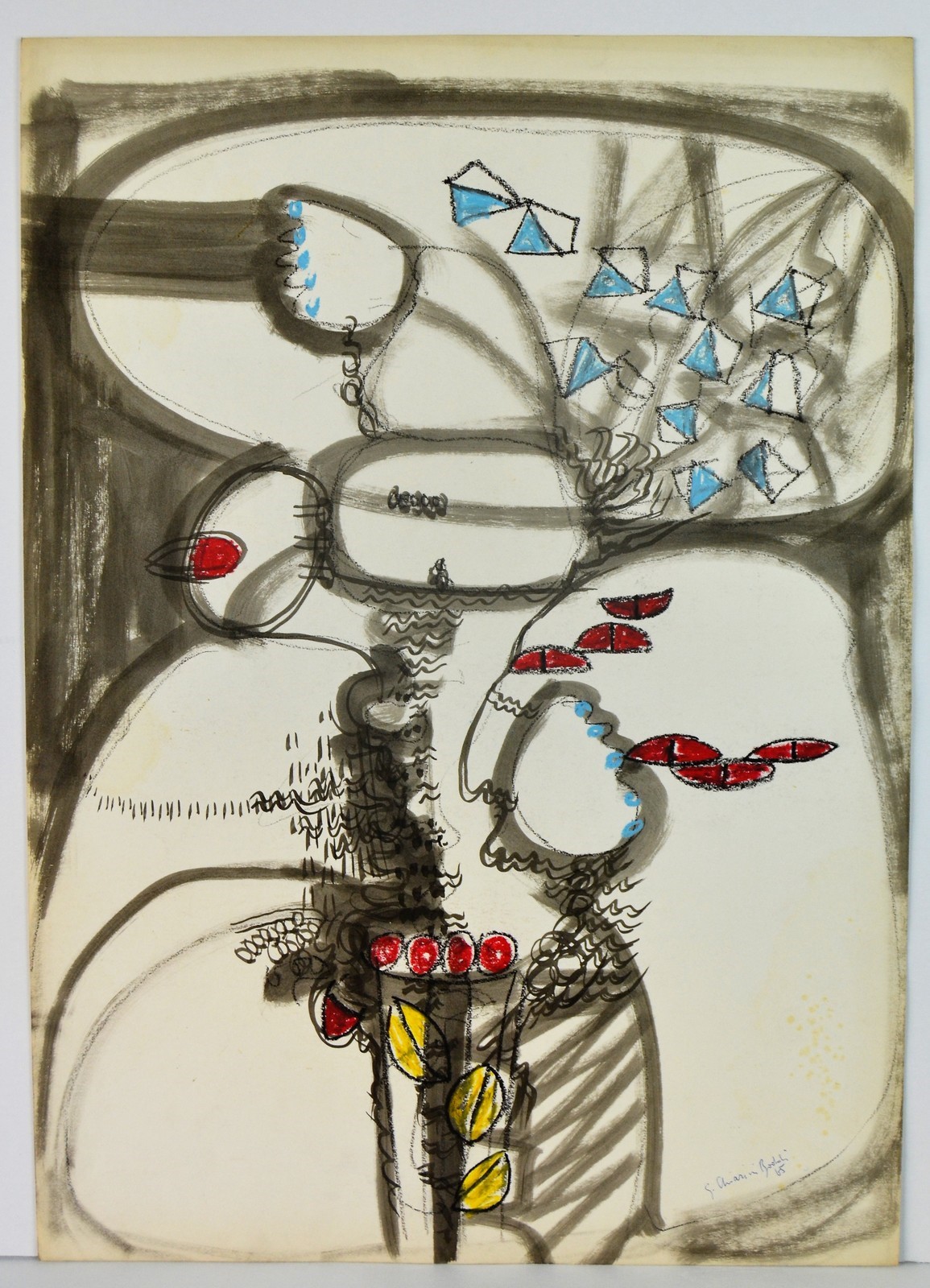 NON IDENTIFICATO AUTORE Senza titolo. 1965. Tecnica mista su carta. Cm 70,00 x 50,00. Firma (G. Chiarini Bortoli) e anno in basso a destra.