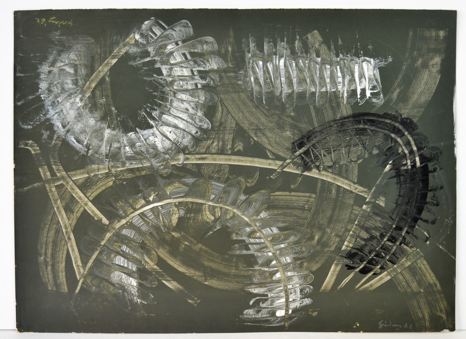 NON IDENTIFICATO AUTORE Senza titolo. 1962. Olio su carta. Cm 68,50 x 50,00. Firma (Giordano) in basso a destra.