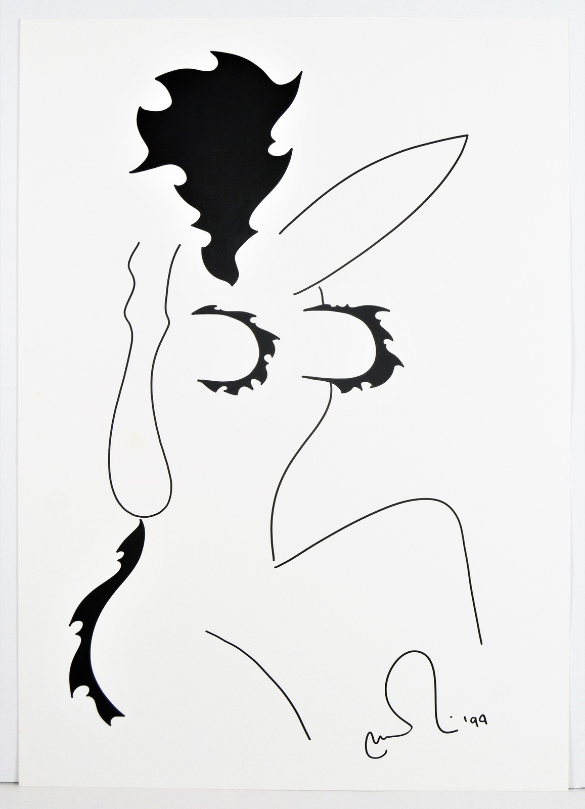 NON IDENTIFICATO AUTORE Senza titolo. 1999. Disegno a china su cartoncino. Cm 50,00 x 70,00. Firma e anno in basso a destra.