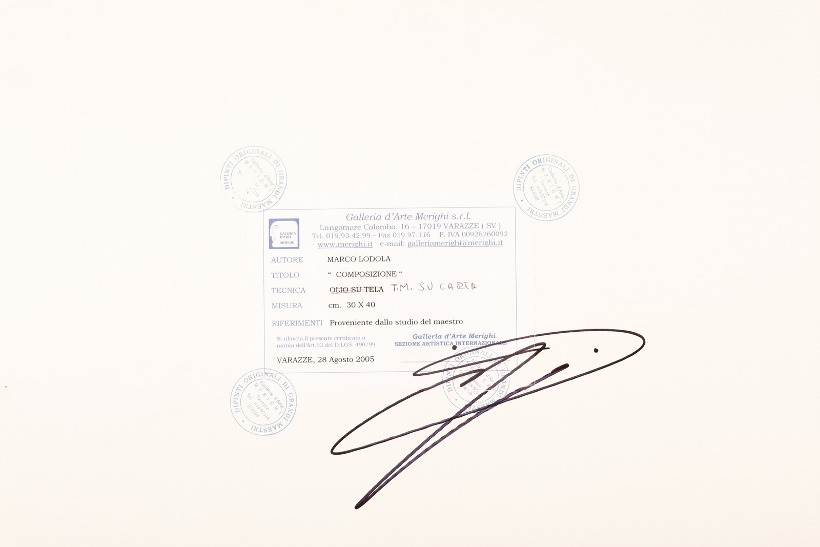 LODOLA MARCO (n. 1955) Composition. 1997. Mixed media on paper. Cm 32,00 x 46,00. Signature and year lower right. At the back Merighi Gallery, Varazze label and stamps. Cornice presente
