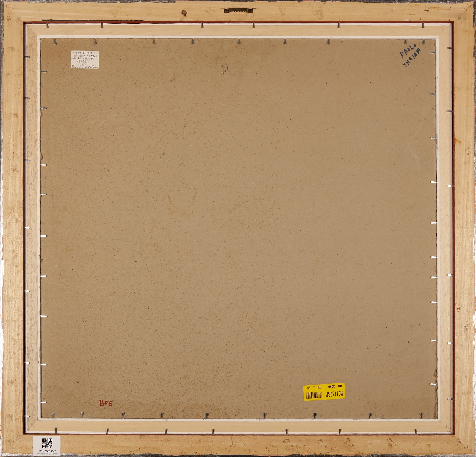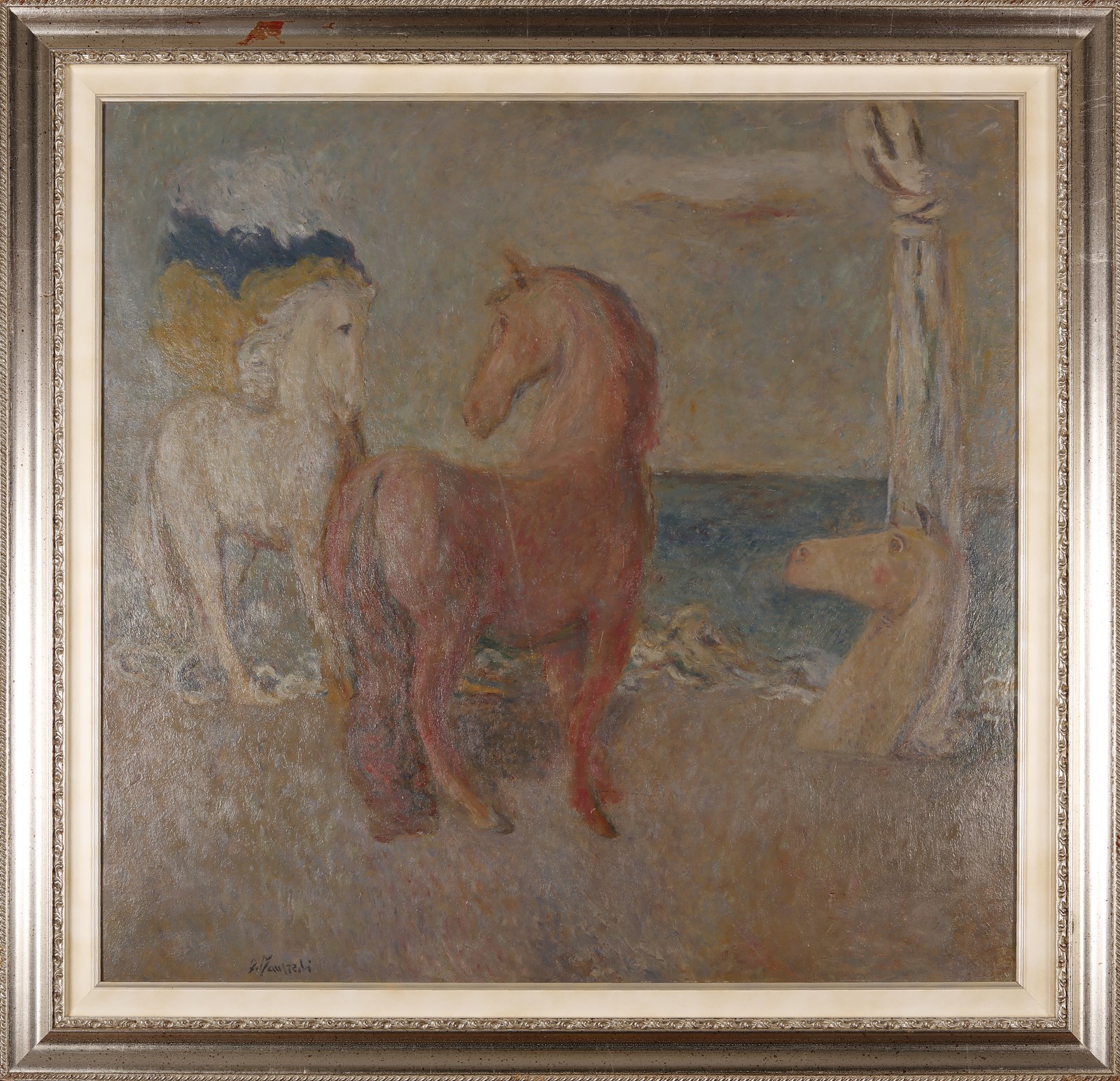 MANFREDI GIUSEPPE (1934 - 1987) Untitled (Scena di cavalli in riva al mare). 1982. Oil on cardboard. Cm 76,00 x 74,00. Signature lower left. Telemarket authenticity certificate. Authenticity certificate on photo (wrong size). Cornice presente