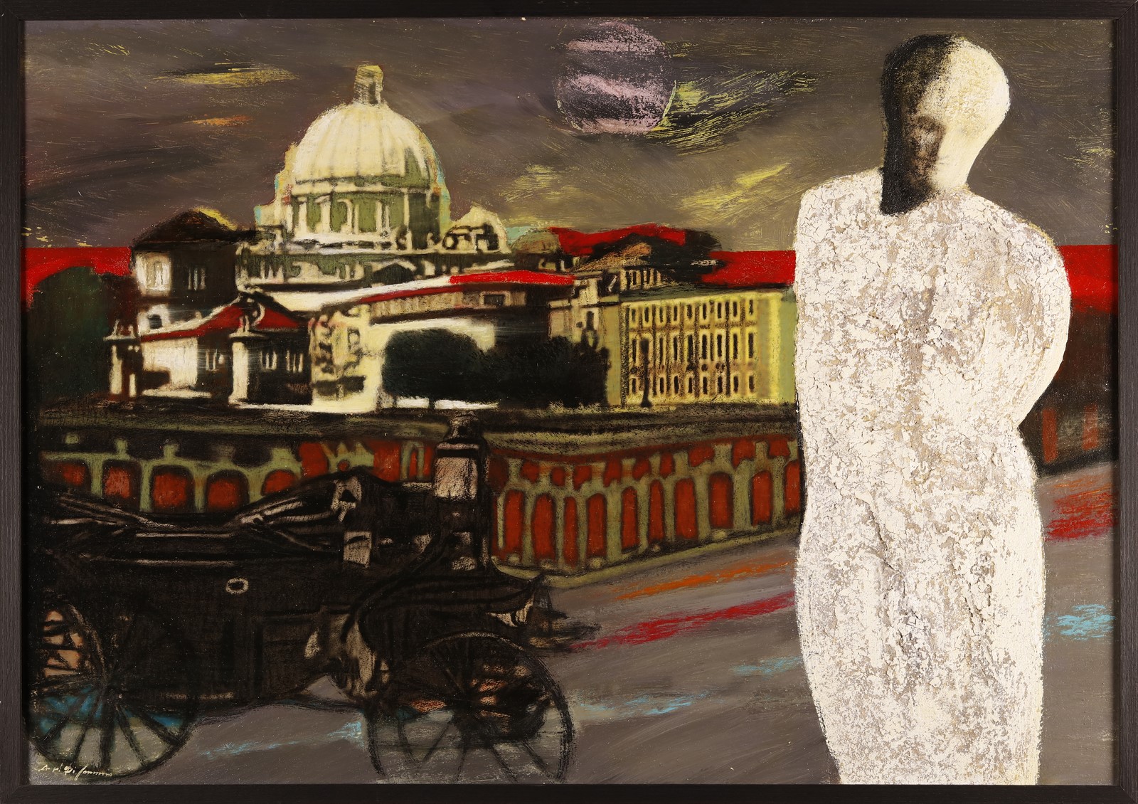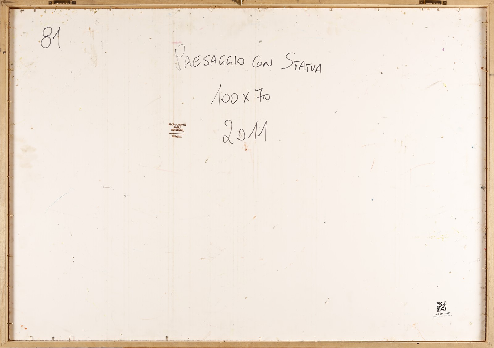 DI TOMMASO ANGELO (n. 1953) Paesaggio con statua. 2011. Olio su cartone. Cm 100,00 x 70,00. Firma in basso a sinistra. Al retro titolo e anno. Cornice presente