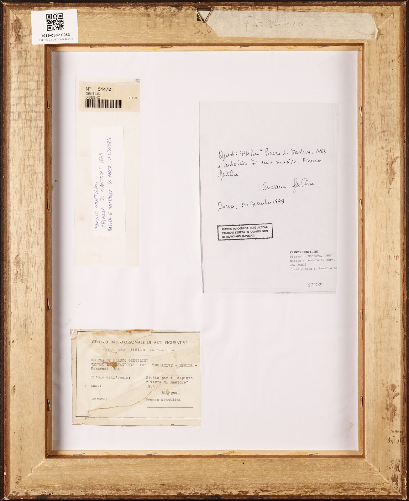 GENTILINI FRANCO (1909 - 1981) Untitled (Piazza di Mantova). 1963. Mixed Media . Cm 23,00 x 30,00. Signature and year lower centre. At the back Luciana Gentilini authenticity certificate and Centro Internazionale di ARti Figurative, Biella 1964 label. Luciana Gentilini's authenticity certificate on photo. Cornice presente