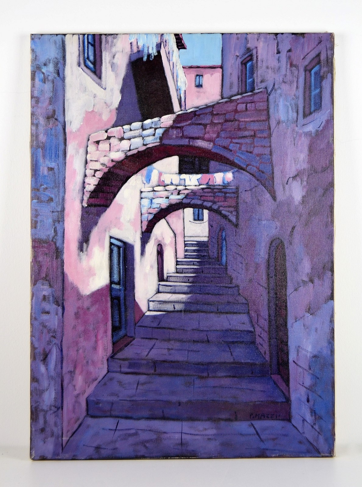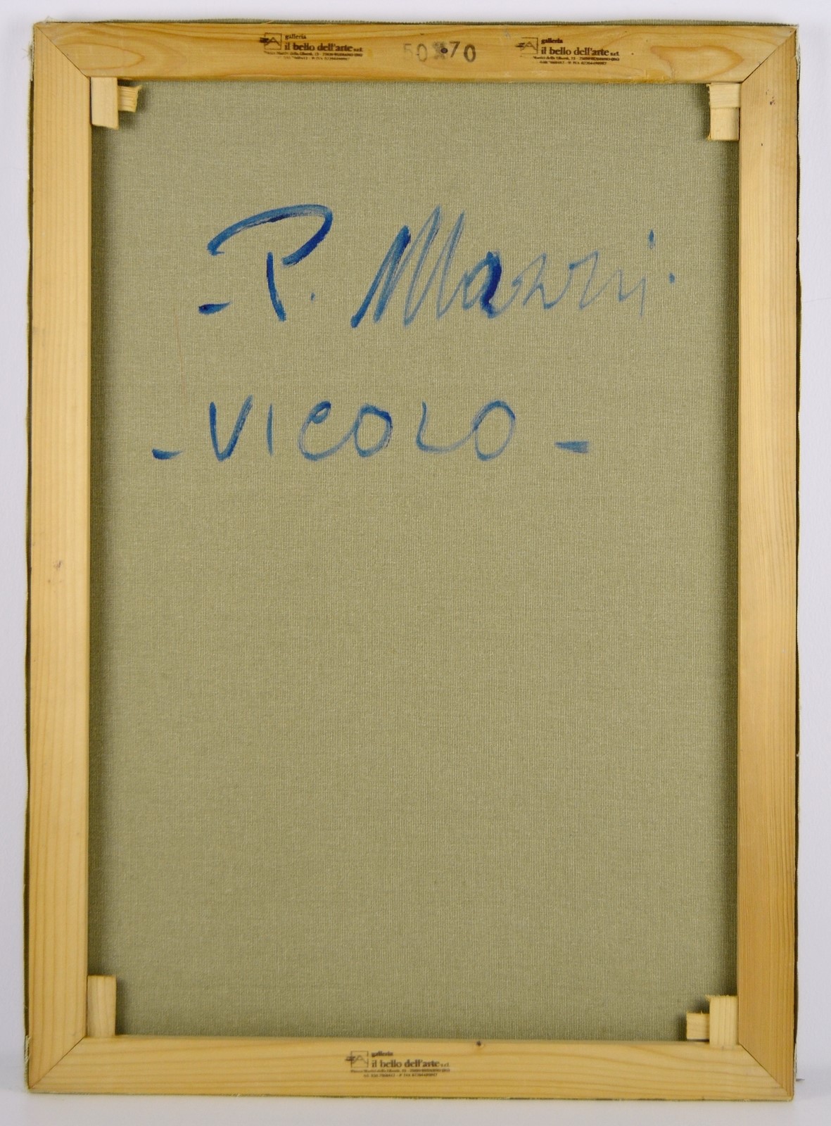 MAZZI PIERO (n. 1938) Vicolo. Olio su tela . Cm 70,00 x 50,00. Firma in basso a destra. Al retro titolo e firma.