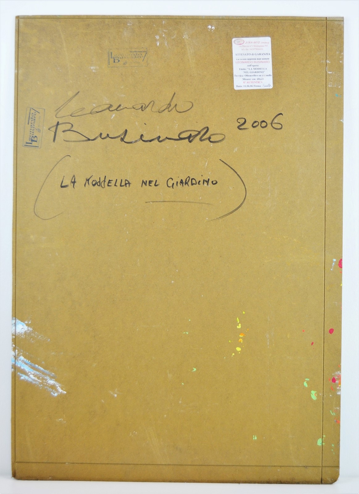 BUSINARO LEONARDO La modella nel giardino. 2006. Olio su tavoletta. Cm 48,00 x 68,00. Firma e anno in basso a sinistra. Al retro titolo, firma e anno.
