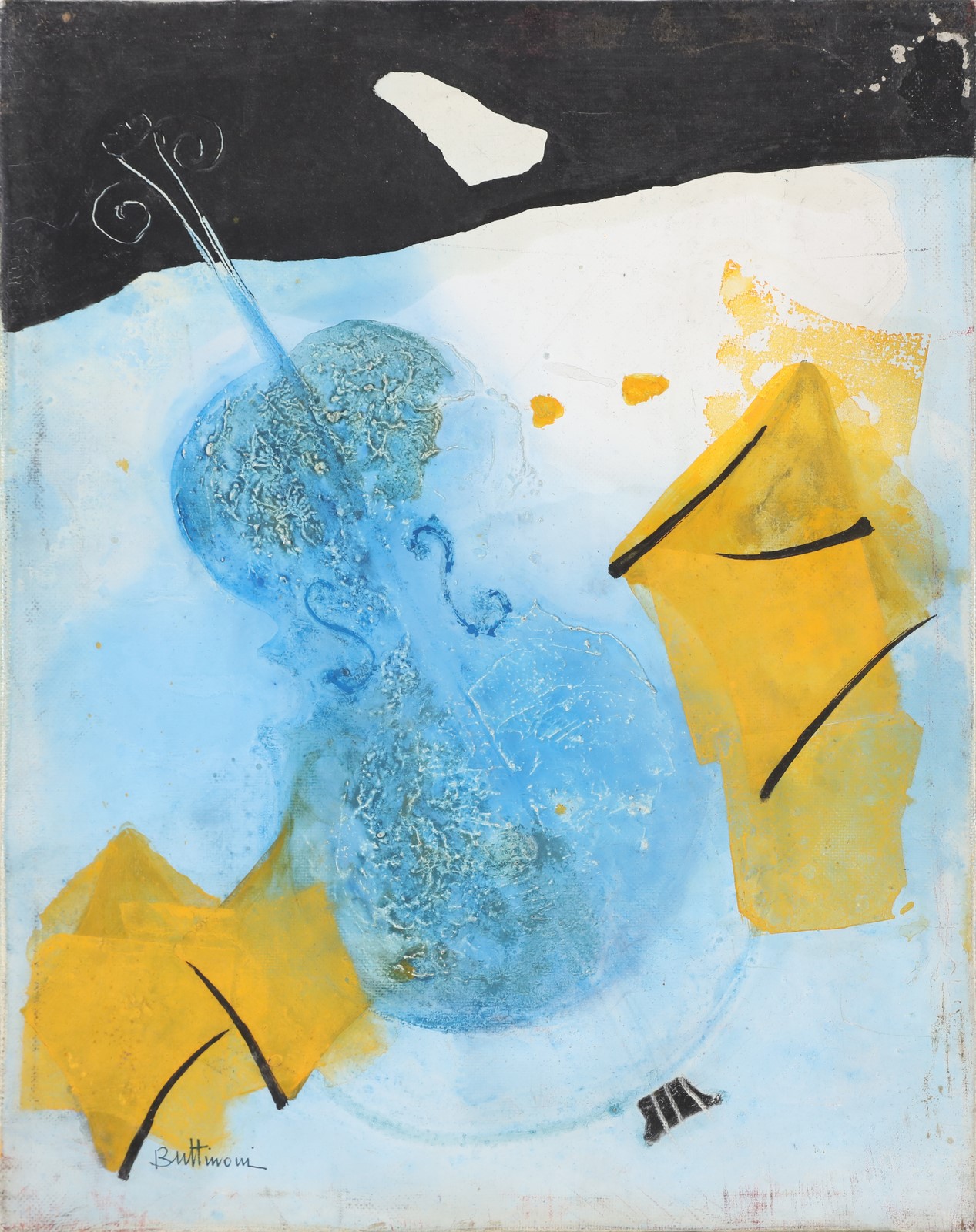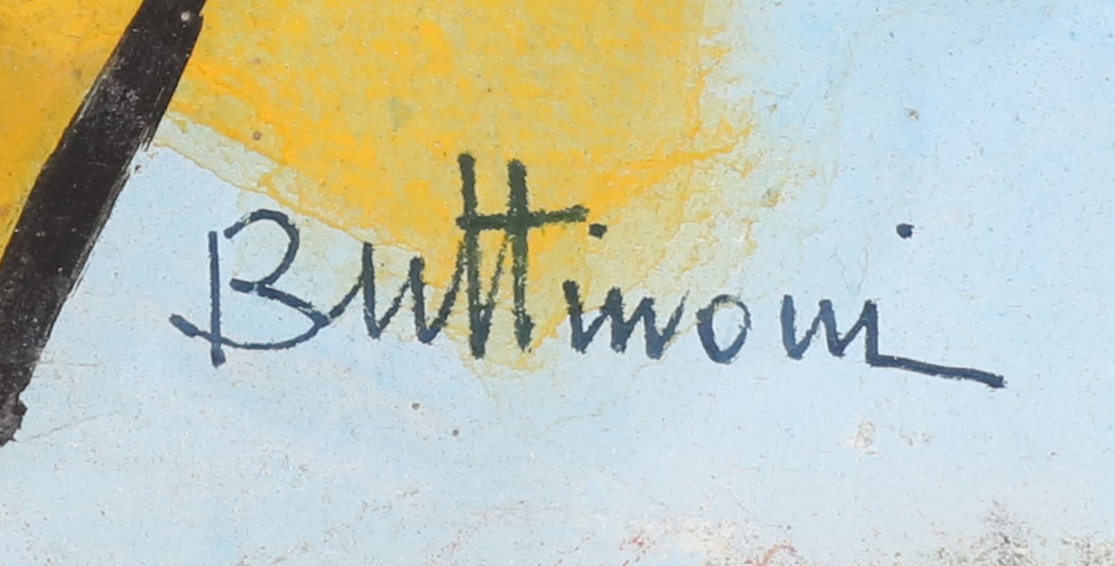 NON IDENTIFICATO AUTORE Senza titolo. Tecnica mista su tela. Cm 24,00 x 30,00. Firmato Buttinoni in basso a sinistra. Al retro firma, anno e timbro Galleria Ferrari, Treviglio.