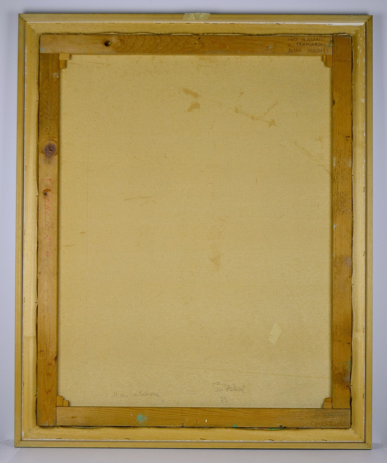 GAIANI GIO (n. 1938) Last generation. 1973. Mixed media on canvas. Cm 80,00 x 100,00. Signature lower right. At the back title, signature and year. Artist's authenticity certificate on photo. Small defects.. Cornice presente