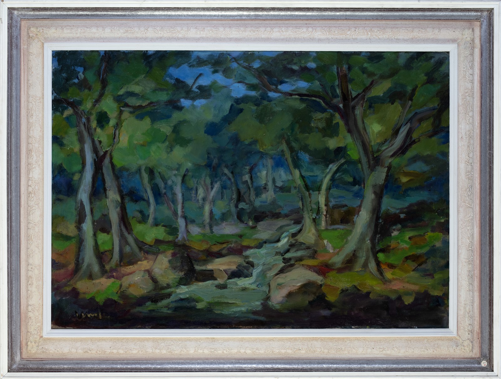 NON IDENTIFICATO AUTORE Sorgente nel bosco. 1971. Olio su tela . Cm 100,00 x 70,00. Firma in basso a sinistra. Al retro titolo, firma e timbro della Galleria Poleschi, Milano. . Cornice presente