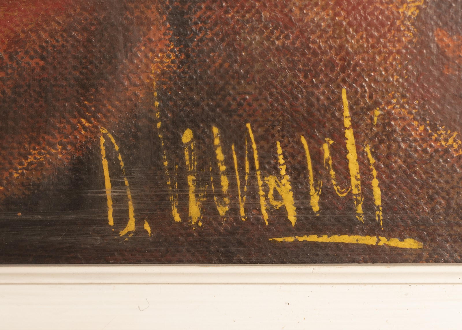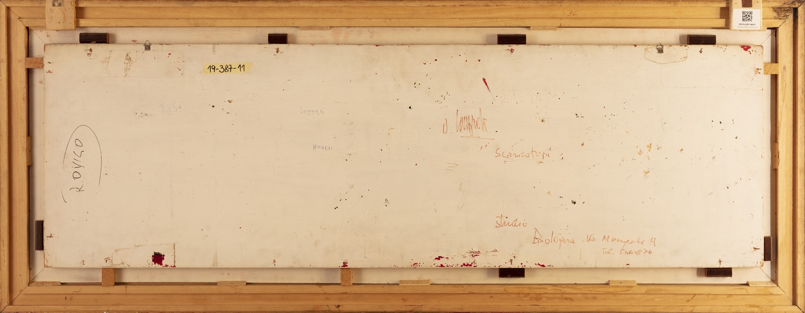 NON IDENTIFICATO AUTORE Untitled (Scaricatori). Tempera on board. Cm 140,00 x 43,00. Signature (D. Lonardi) lower right. Signature and year at the back. Cornice presente
