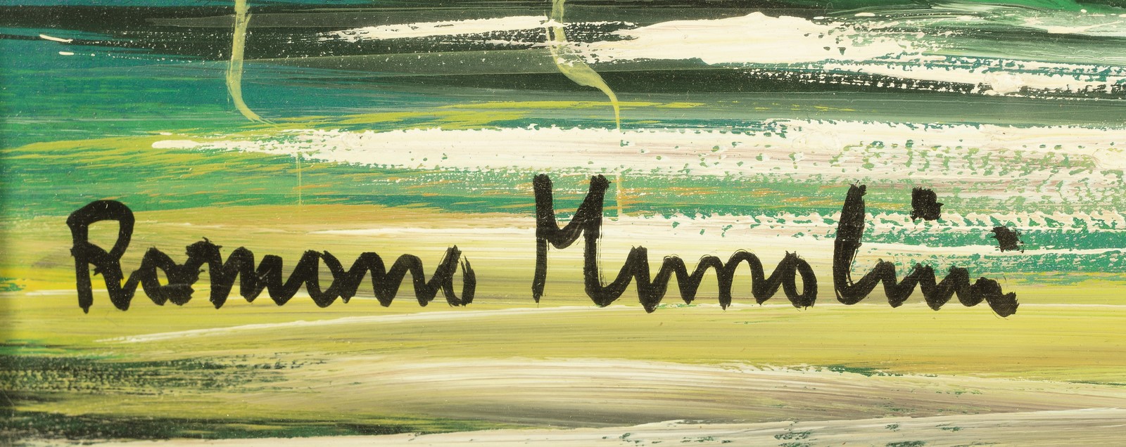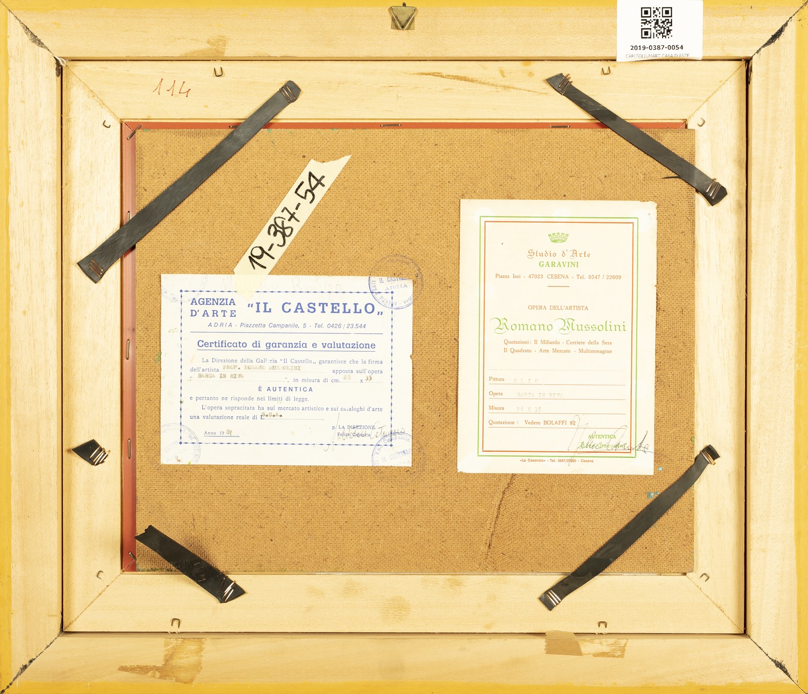 MUSSOLINI ROMANO (1927 - 2008) Untitled. Oil on panel. Cm 35,00 x 28,00. Signature lower left. At the back Studio D'Arte Gravini, Cesena label and il Castello Gallery, Adria label.. Cornice presente