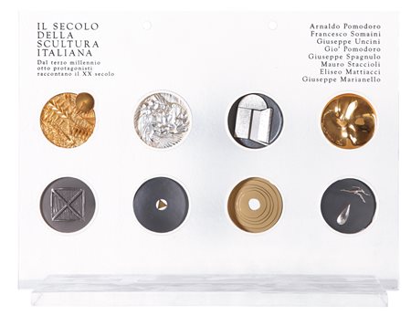AUTORI VARI Il secolo della scultura italiana, Dal terzo millennio otto protagonisti raccontano il XX secolo lotto di otto sculture in metalli diversi diametro cm. 6 cadauna, entro supporto espositore in plexiglass cm. 29,5x40x15, realizzate da Arnaldo Pomodoro, Francesco Somaini, Giuseppe Uncini, Giò Pomodoro, Giuseppe Spagnulo, Mauro Staccioli, Eliseo Mattiacci, Giuseppe Marianello per Marco Cornali Editore, esemplare 332/999 (solo i primi 100 in numeri arabi + 20 in numeri romani sono firmati dagli artisti), con custodia originale contenente otto supporti da parete.