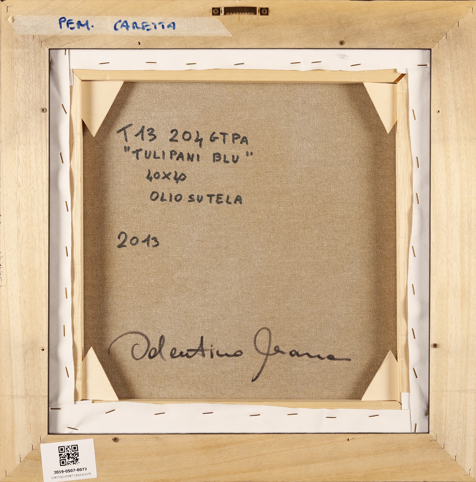 MARRA VALENTINO (n. 1956) Tulipani blu. 2013. Olio su tela . Cm 40,00 x 40,00. Al retro titolo, firma e anno. Cornice presente
