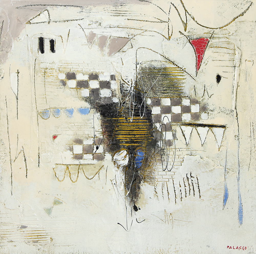 DIEGO PALASGO Noale (VE) 1954 Tentativi di restauro, 2005 polimaterico su tavola cm. 50x50, firma in basso a destra, firma e titolo al retro, certificato d'autenticità della Est Bracha allegato.