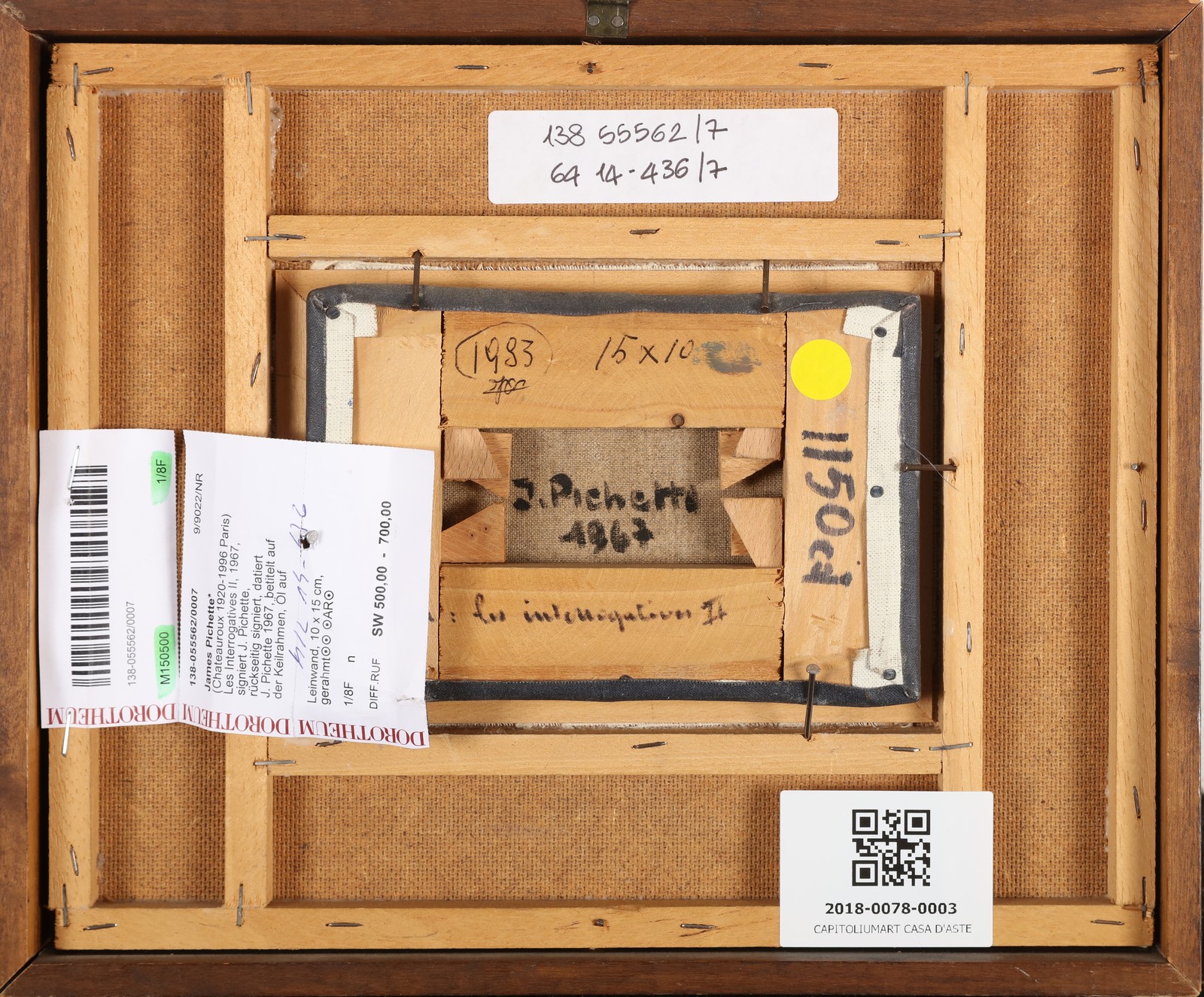 PICCHETTE JAMES (1920 - 1996) Les interrogatives II. 1967. Olio su tela . Cm 15,00 x 10,00. Firma in basso a destra. Al retro titolo, firma e anno. Cornice presente