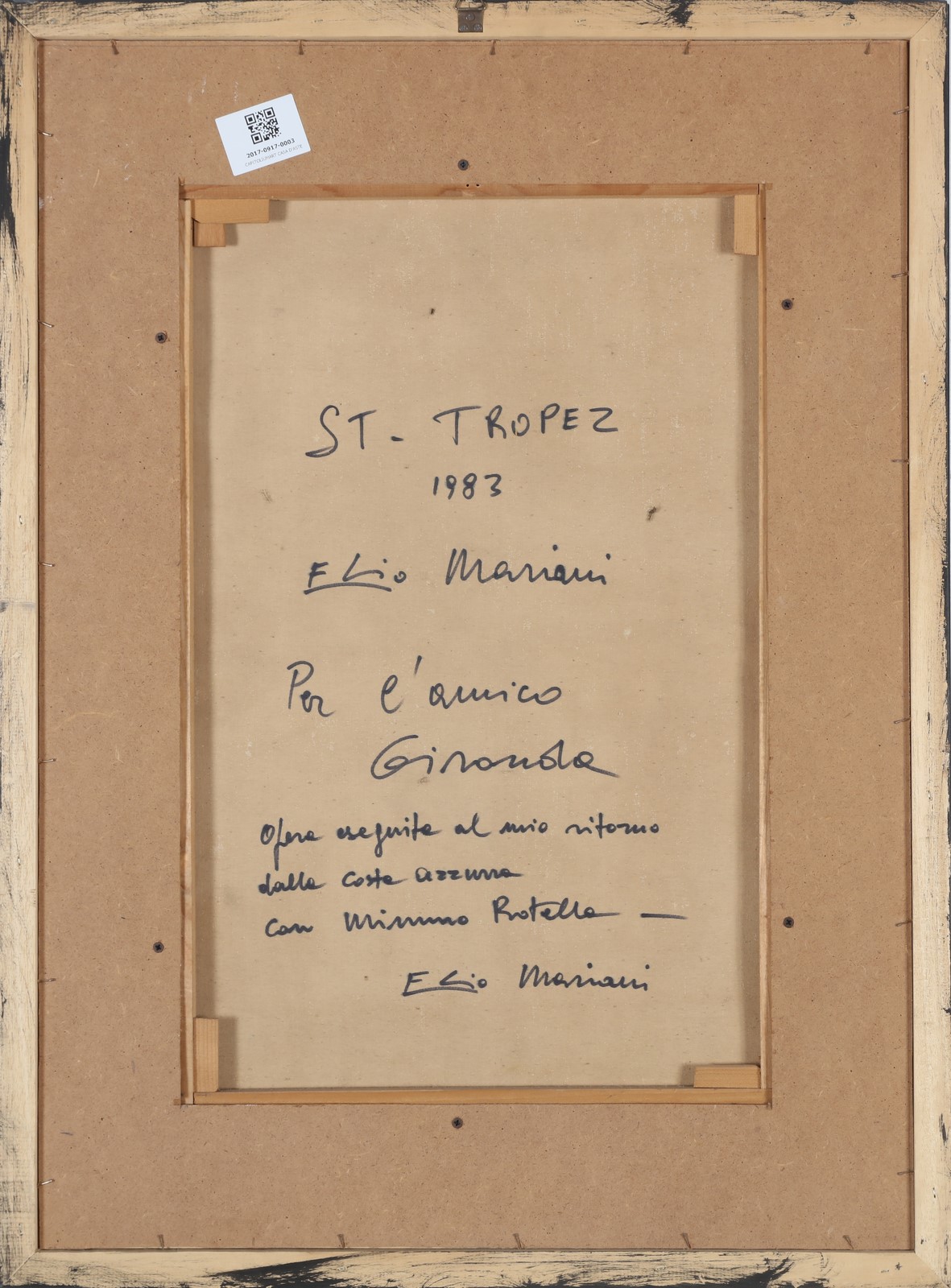 MARIANI ELIO (n. 1943) StTropez. 1983. Tecnica mista su carta su tela. Cm 45,00 x 65,00. Firma e anno in basso a destra. Al retro titolo, firma, dedica e anno. Opera eseguita in collaborazione con Mimmo Rotella. Cornice presente