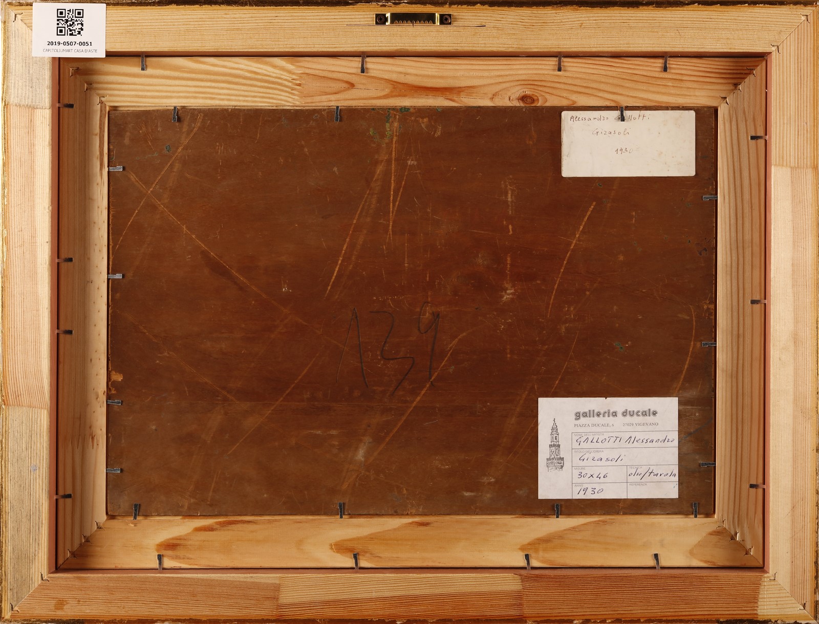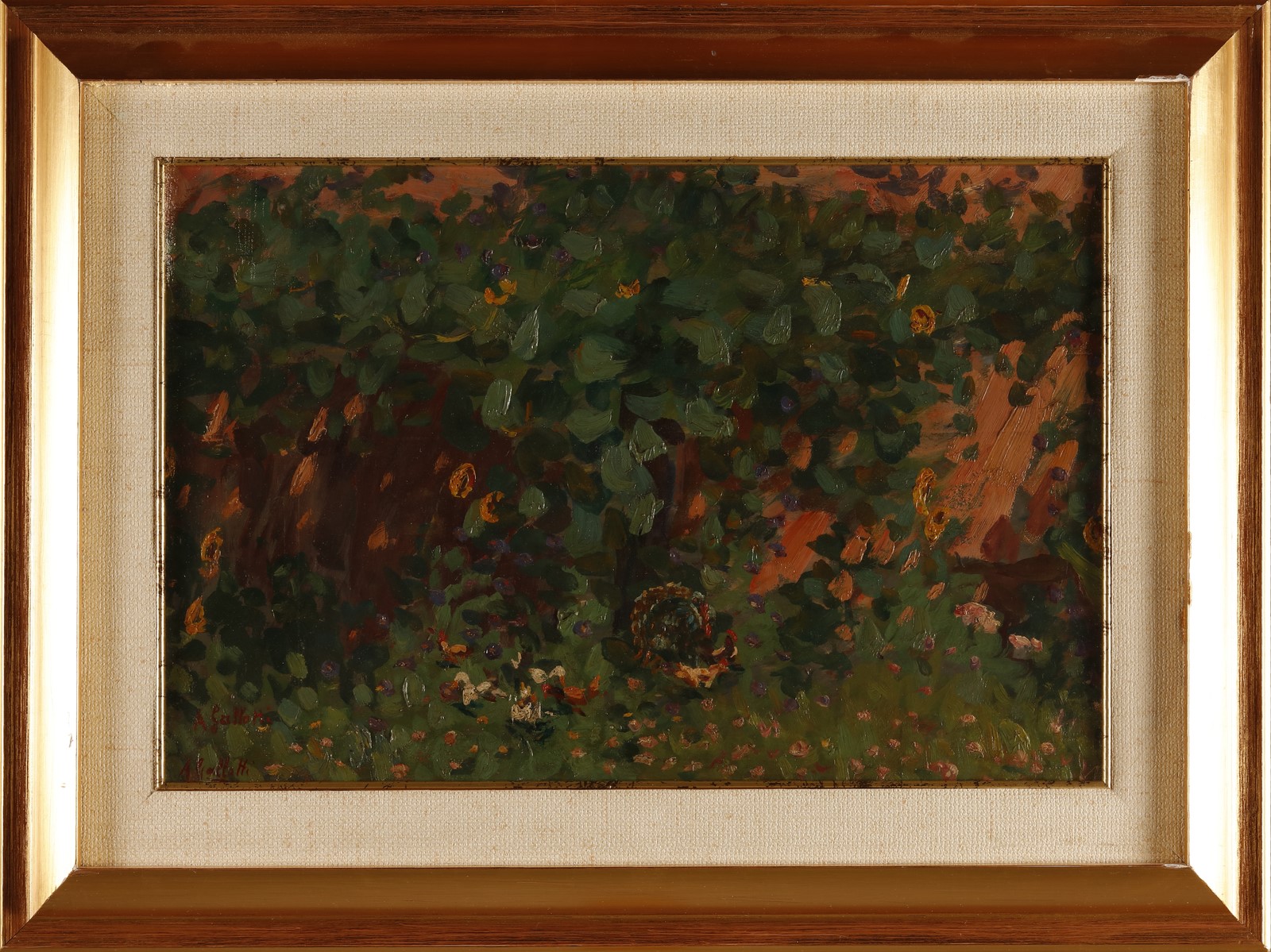 GALLOTTI ALESSANDRO (1879 - 1961) Girasoli. 1930. Olio su tavola. Cm 46,00 x 30,00. Firma in basso a sinistra. Al retro cartiglio descrittivo Galleria Ducale, Vigevano. Cornice presente