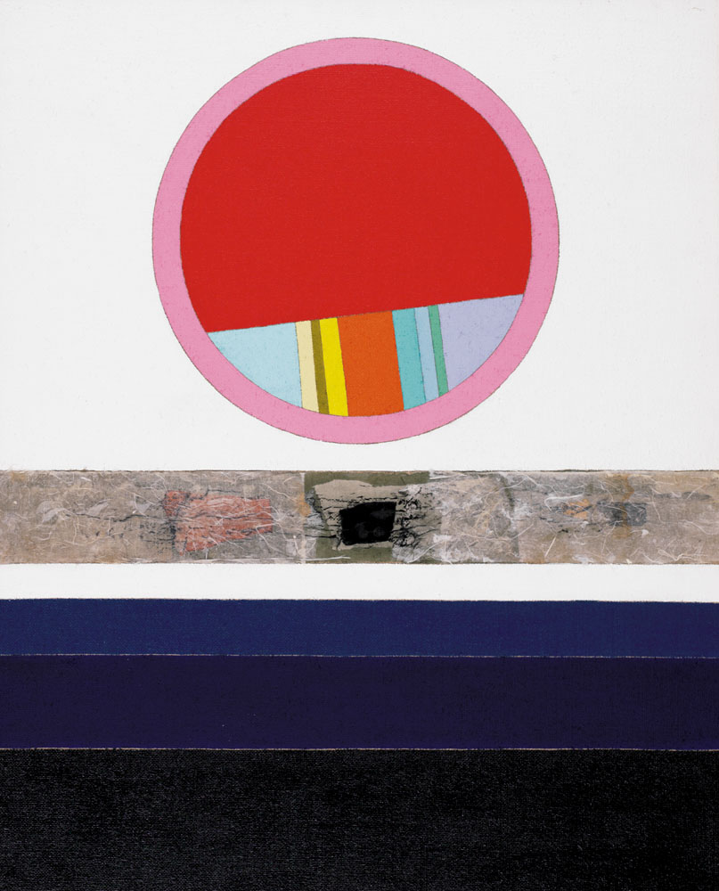 EUGENIO CARMI Genova 17/02/1920 La mia bandiera, 2007 acrilici, vernice e collage su tela di juta cm. 100x80, firma, titolo e anno al retro, dichiarazione d'autenticità dell'artista su foto.