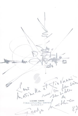 GEORGES MATHIEU Boulogne sur Mer 1921 - Boulogne-Bilancourt 12/06/2012 Senza titolo, 1987 pennarello su carta cm. 30x20, firma, anno e dedica dell'artista ad personam in basso a destra, certificato di provenienza della Allegrini Arte (BS) su stampa fotografica allegato.