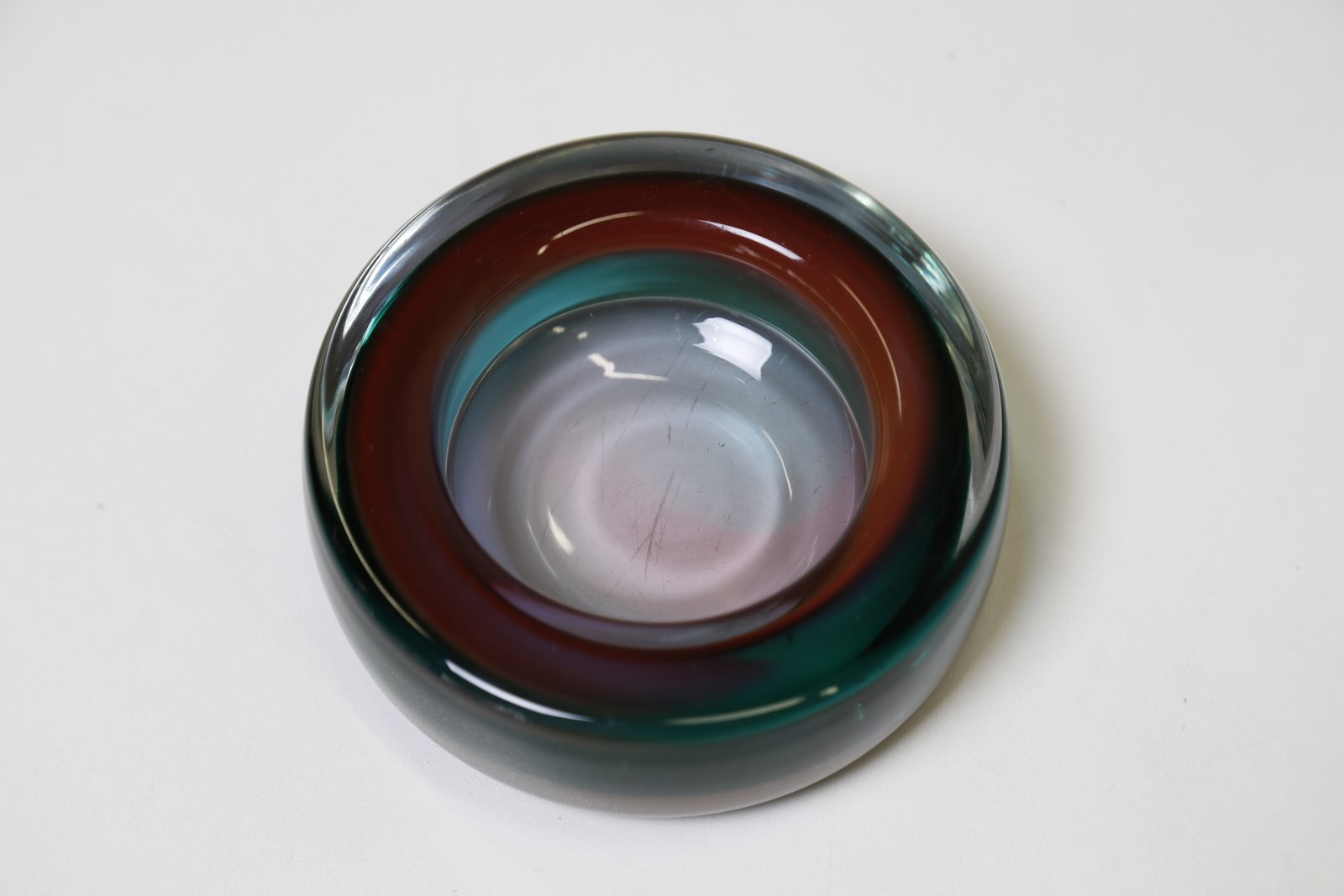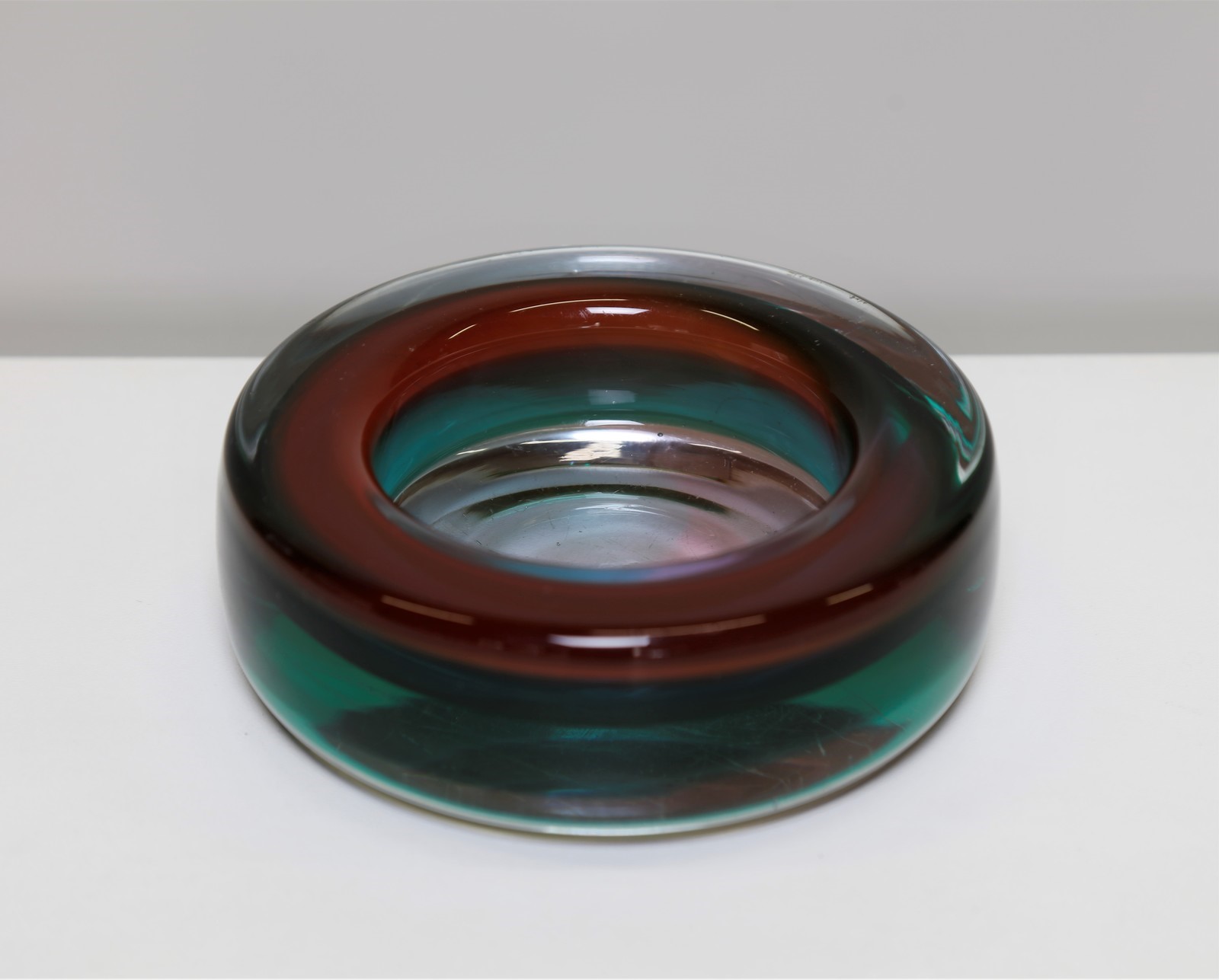 MANIFATTURA MURANO Ciotola. Vetro di Murano. Cm 12,50 x 4,00 x 12,50. Ciotola con fasce di colore verde e marrone, anni 60.