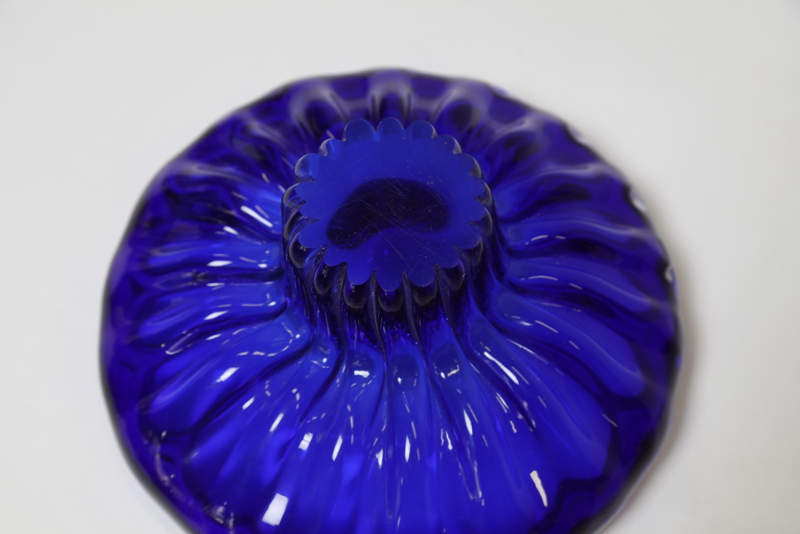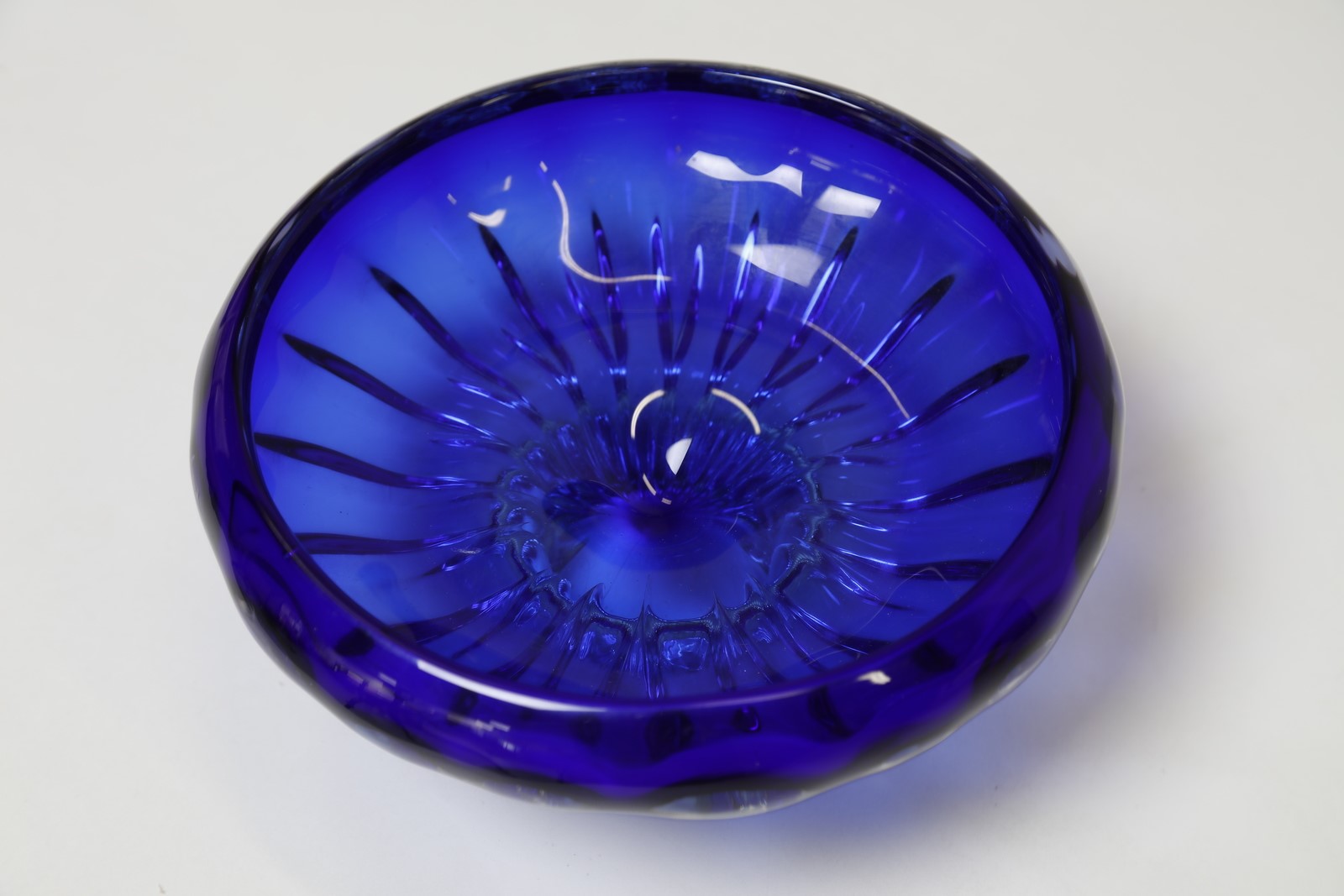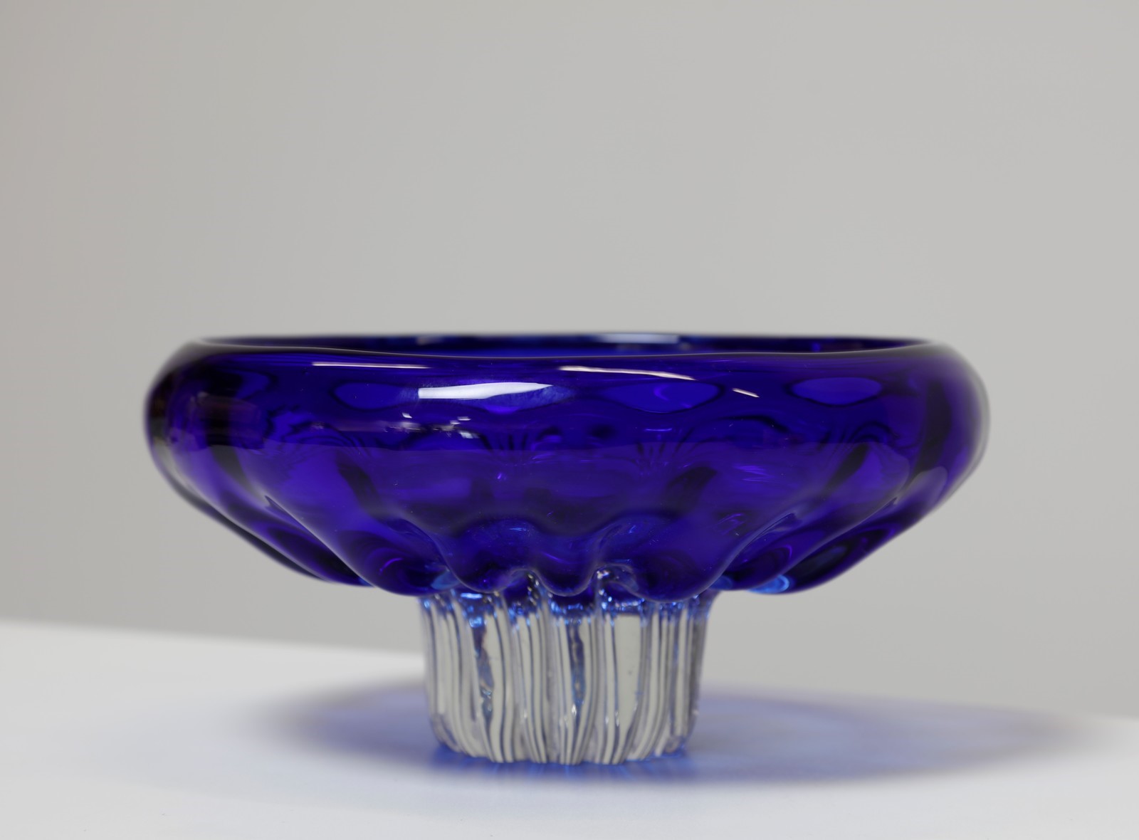 MANIFATTURA MURANO Bowl. Murano glass. Cm 24,00 x 12,00 x 24,00. Blue ribbed glass bowl with applied base in transparent ribbed glass.