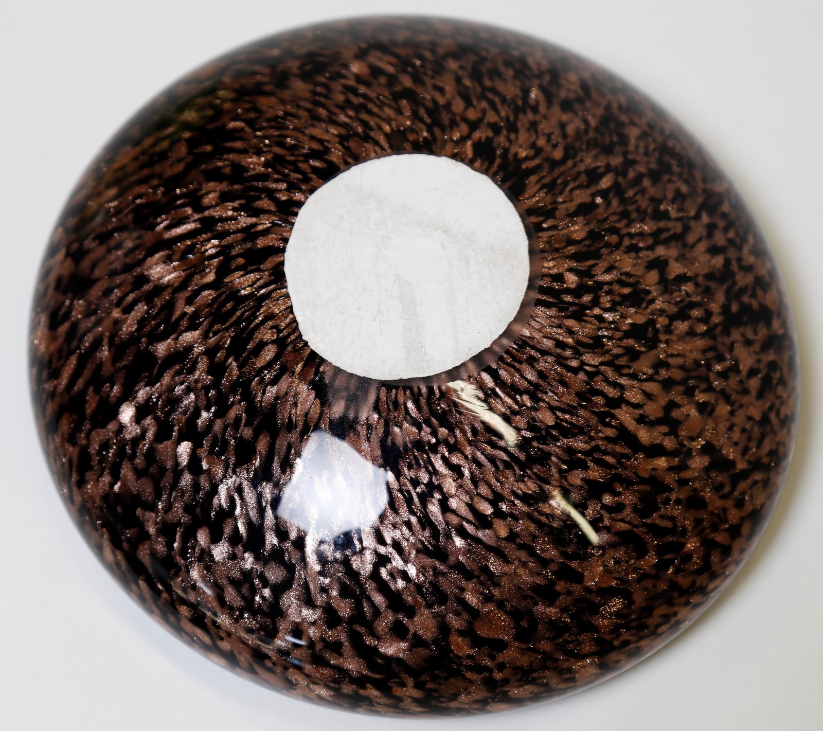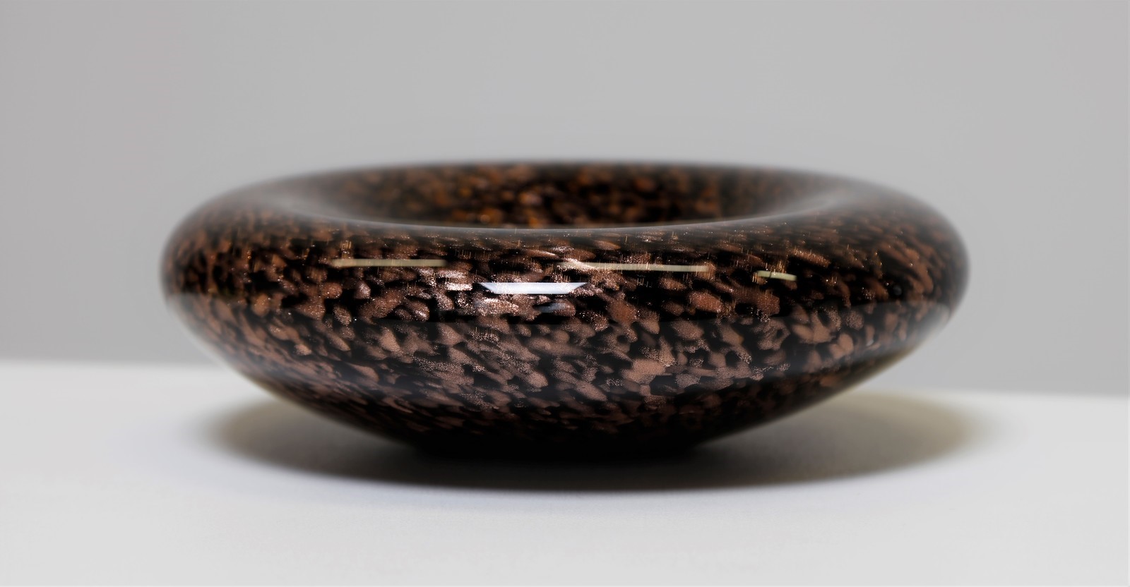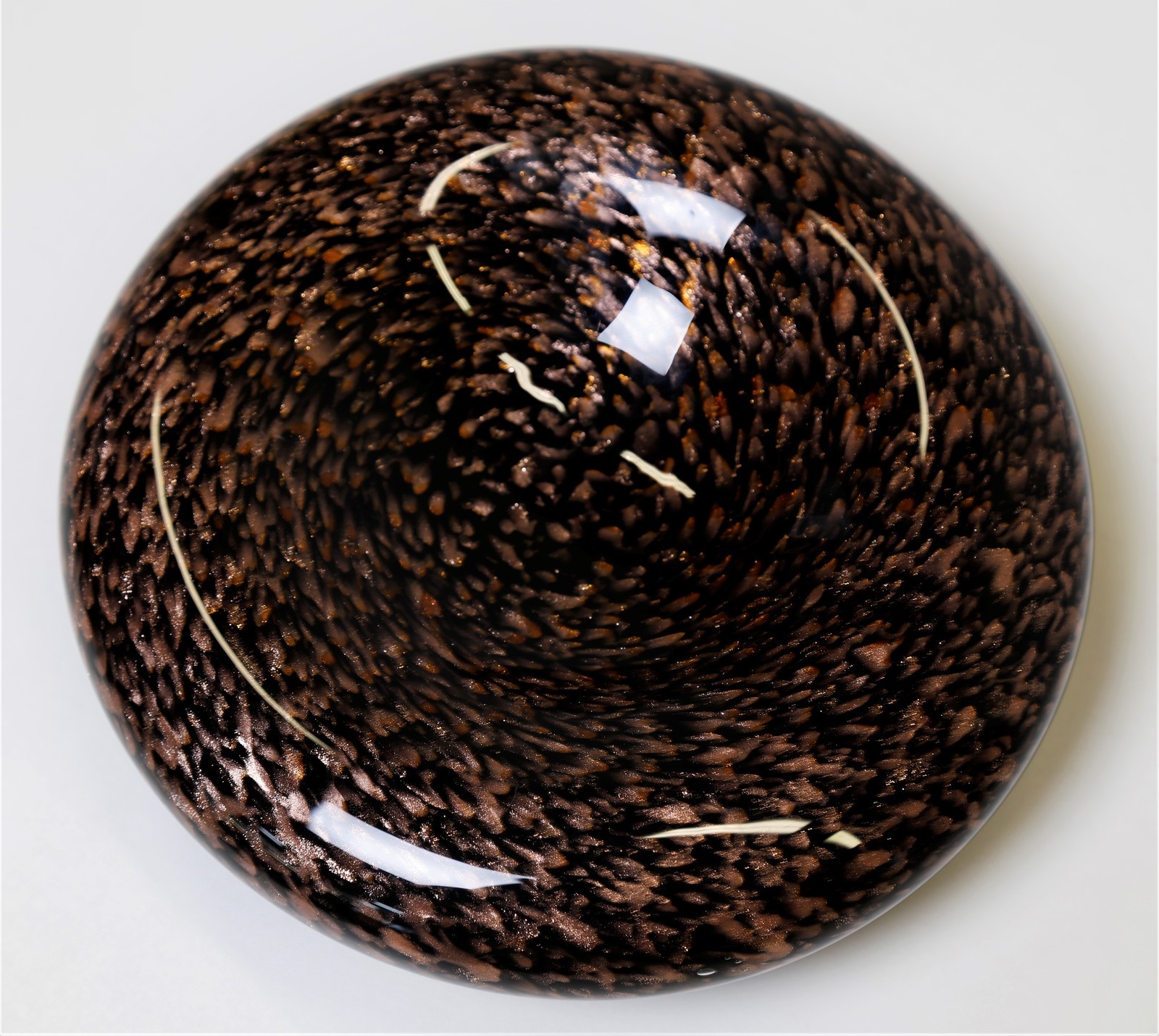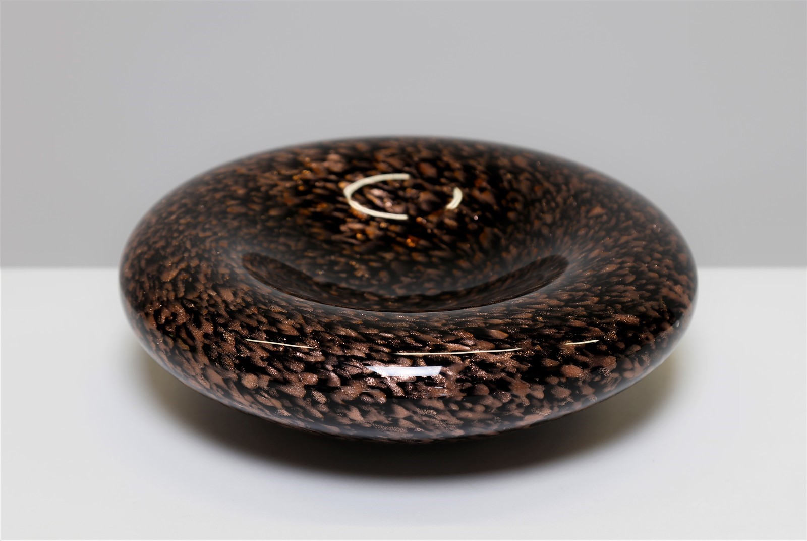 MANIFATTURA MURANO Ciotola. Vetro di Murano. Cm 20,00 x 6,00 x 20,00. Ciotola in vetro nero con applicazione frammenti di avventurina. Anni ‘60