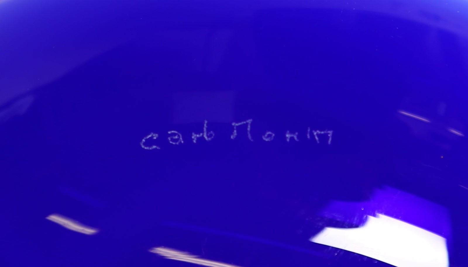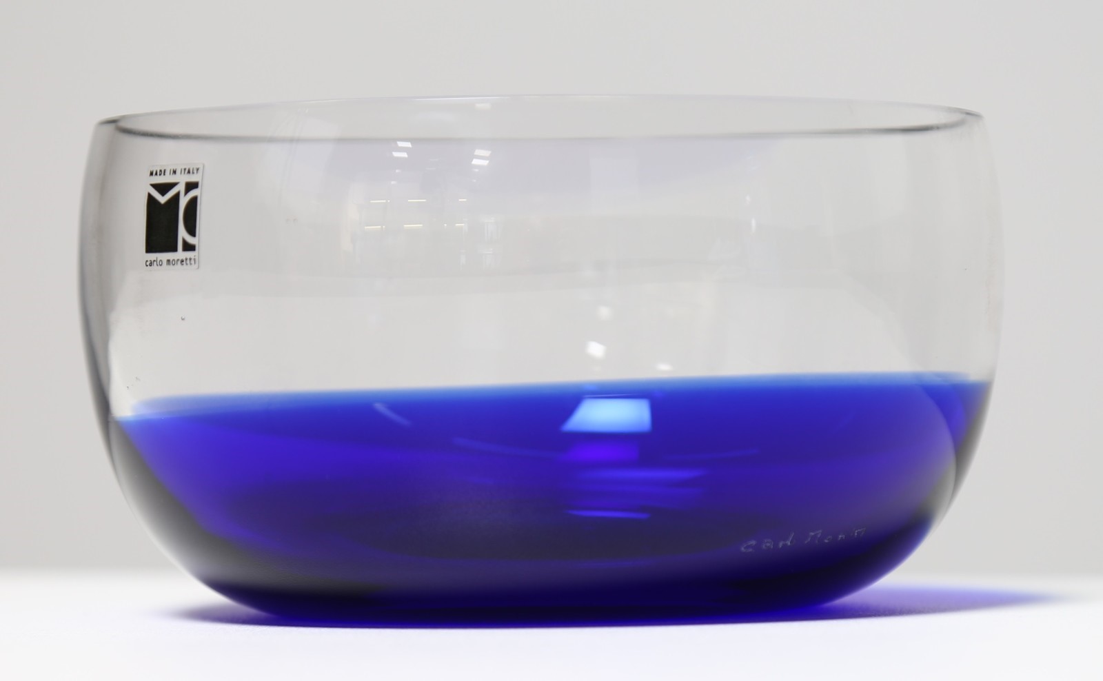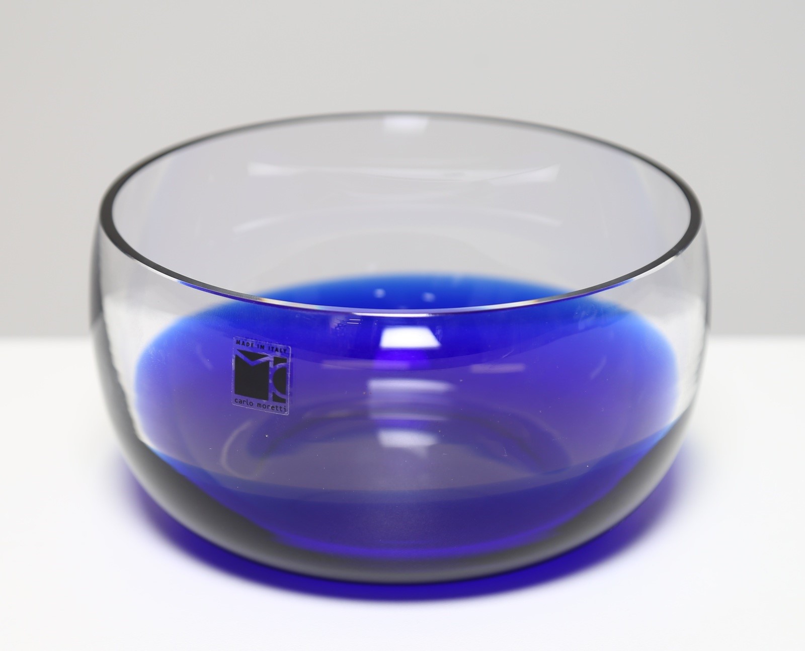 MORETTI CARLO Ciotola. Vetro di Murano. Cm 15,00 x 8,00 x 15,00. Vetro di Murano, cristallo e blu. Anni 80. Firma alla base.