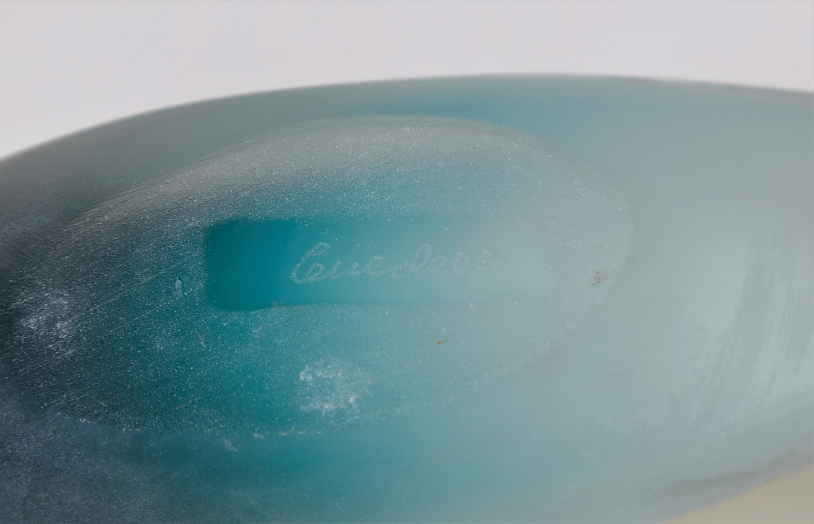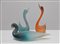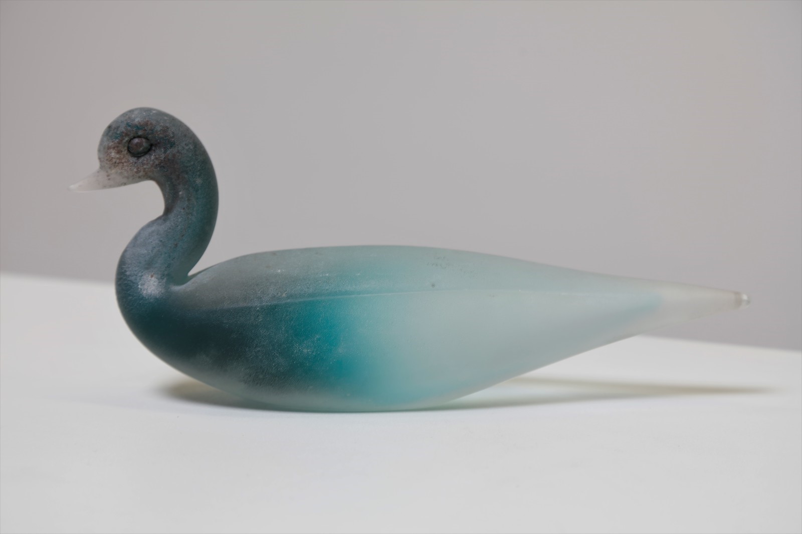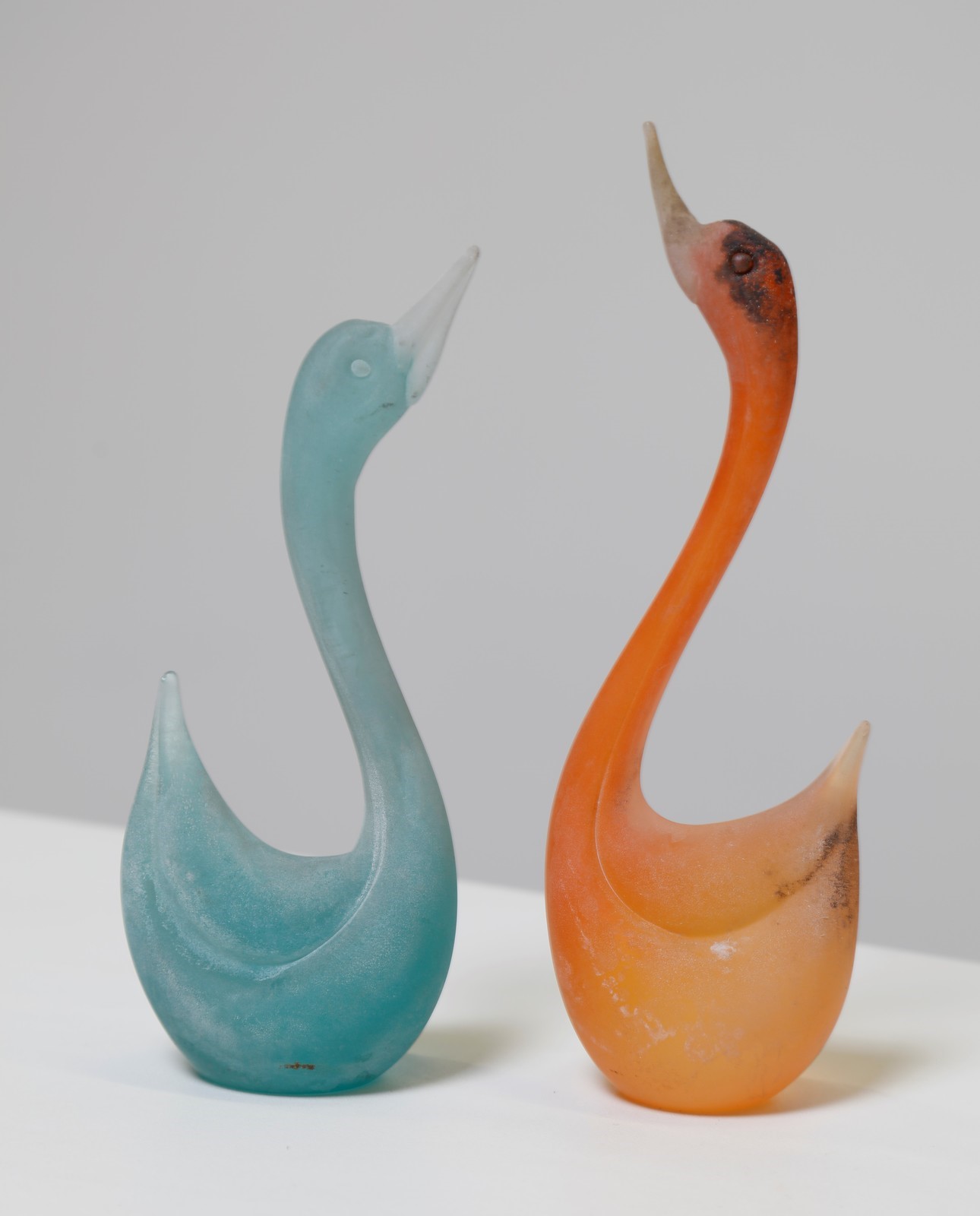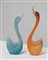 VETRERIA CENEDESE Tre papere. Vetro di Murano. Cm 23,50 x 11,00 x 6,00. Tre figure di papere in vetro colorato, una con colore sfumato. Superficie con tecnica “scavo”. Anni ‘60.