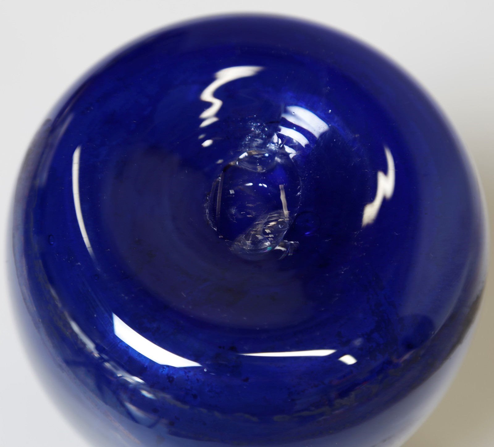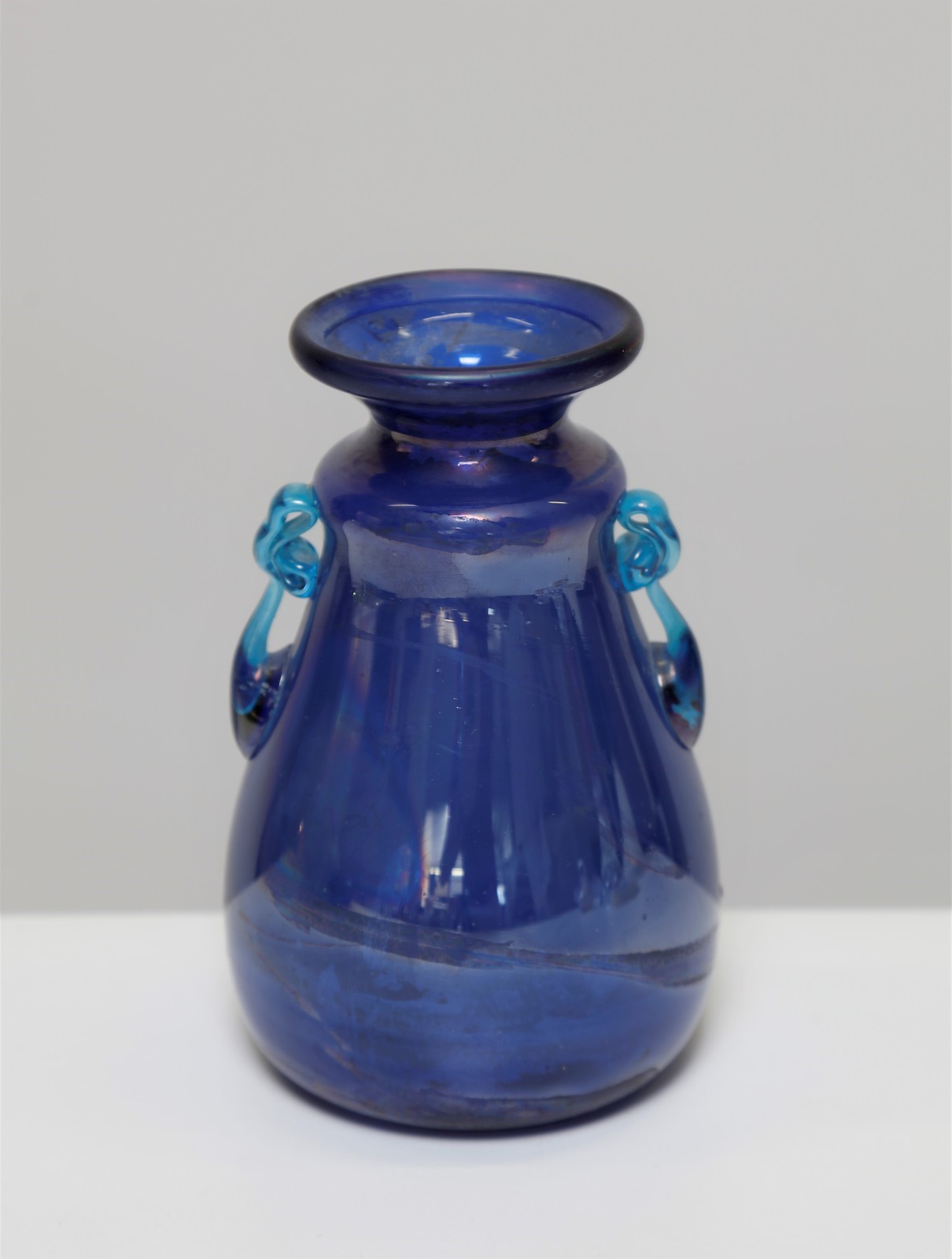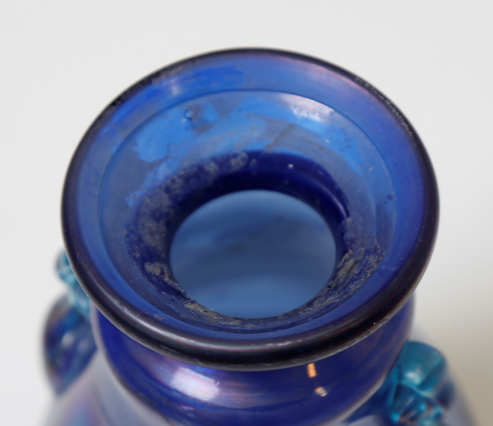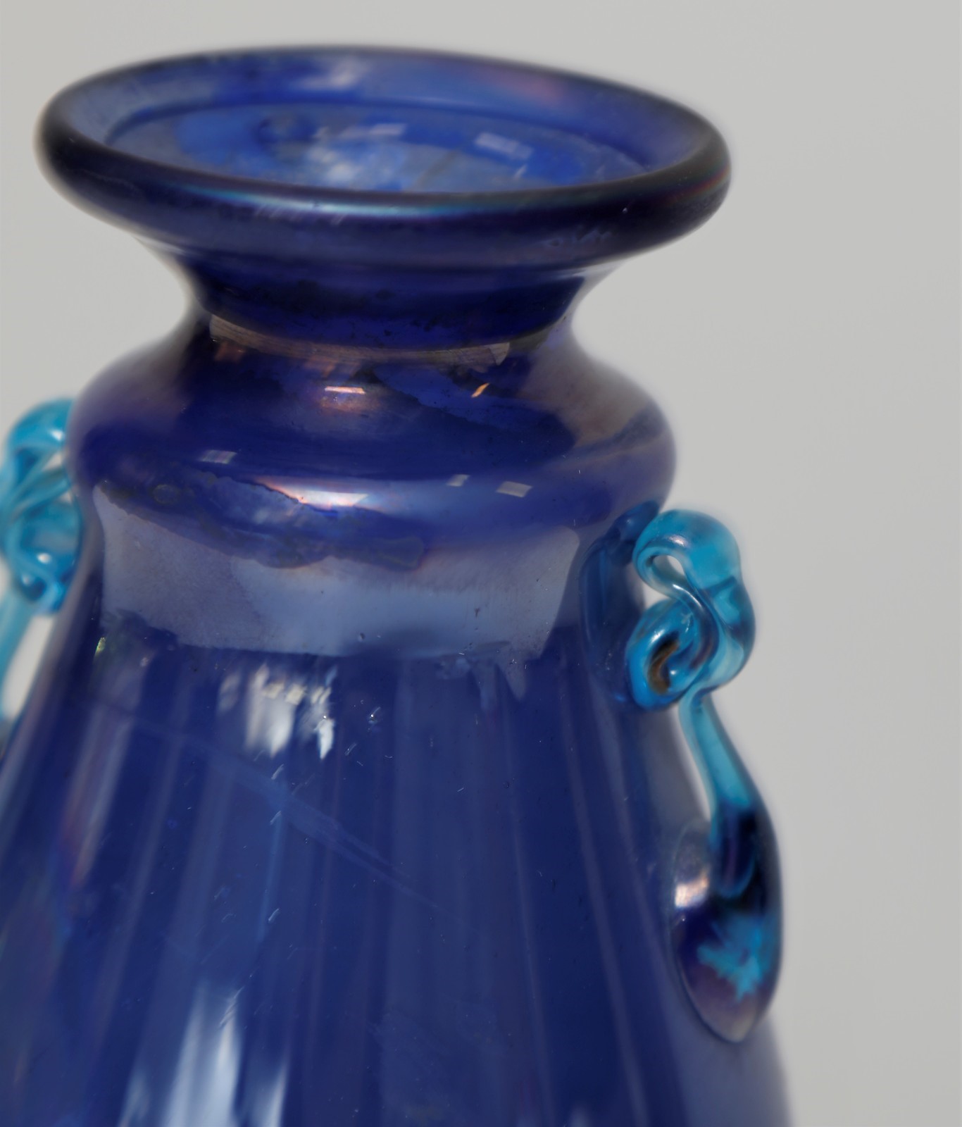 MANIFATTURA MURANO Vaso. Vetro di Murano. Cm 9,00 x 14,00 x 9,00. Vaso in vetro blu con morise applicate in color celeste. Anni’40