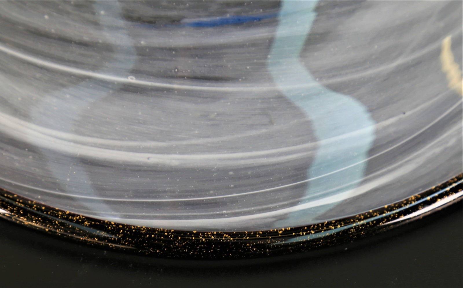 BAROVIER & TOSO Centrotavola. Vetro di Murano. Cm 25,50 x 9,50. Centrotavola in vetro trasparente, base in foglia oro e orlatura in nero, anni 70. Firma alla base