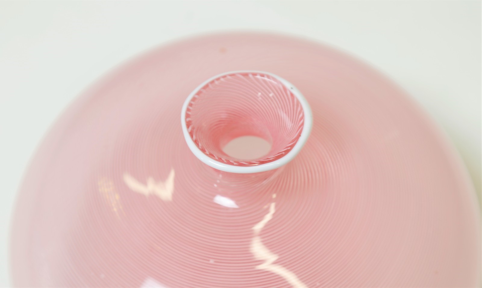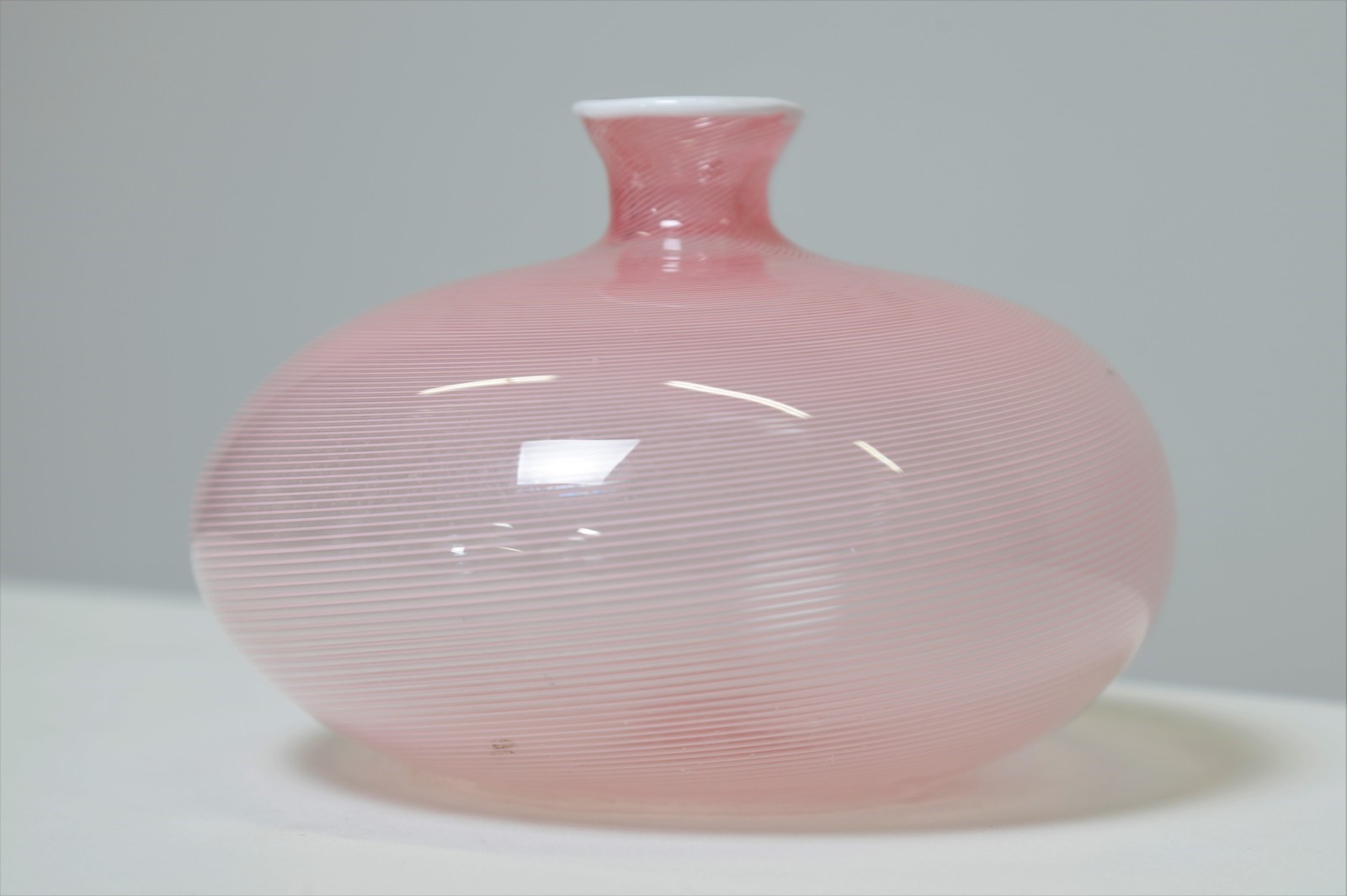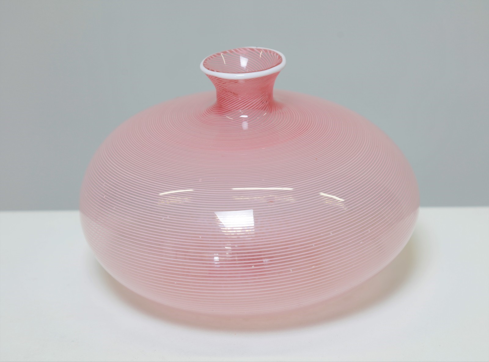 BAROVIER & TOSO Vaso. Vetro di Murano. Cm 19,00 x 13,00 x 19,00. Vaso in vetro rosso con decoro a mezza filigrana in lattimo. Collo con filo in lattimo applicato.