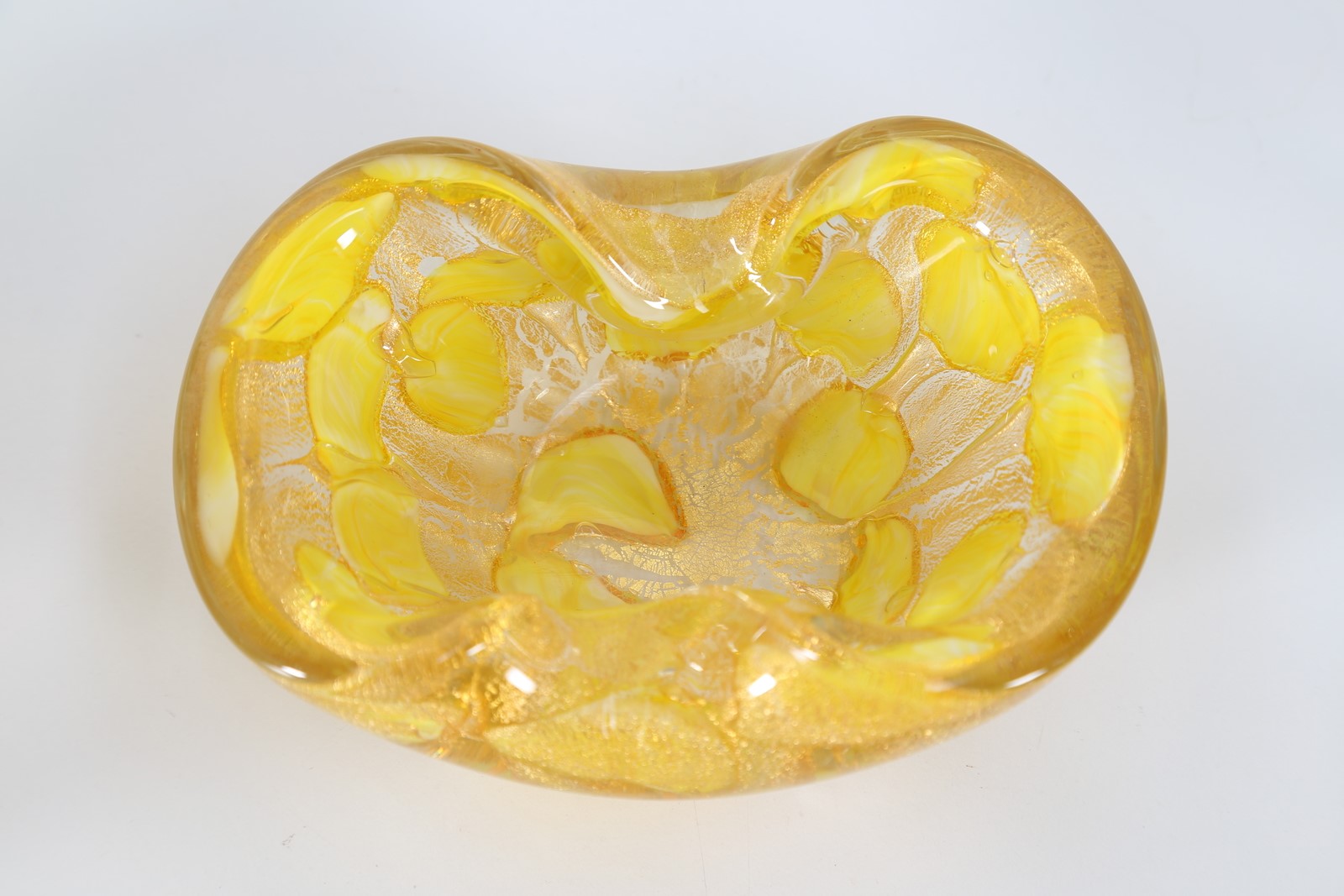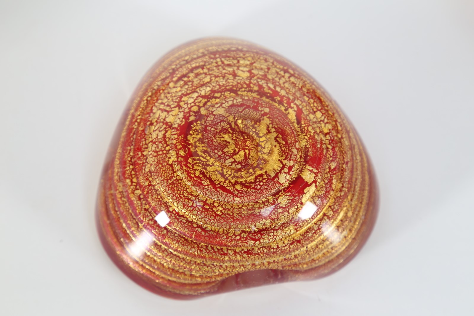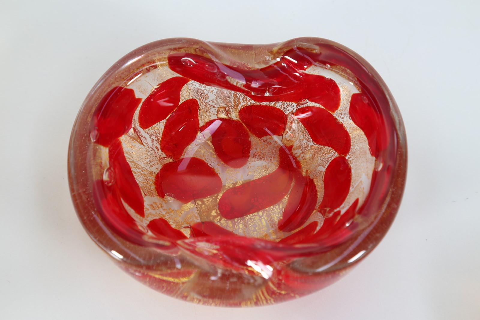 BAROVIER & TOSO Five ashtrays. Murano glass. Cm 14,50 x 7,00 x 14,50. Five ashtrays, decorated with gold leaf, different techniques. 50s. Measurements: 5.5 x 14.5 x 12.5 cm - 6 x 12.5 x 12.5 cm - 6 x 15 x 10.5 cm - 5 x 12 x 12 cm