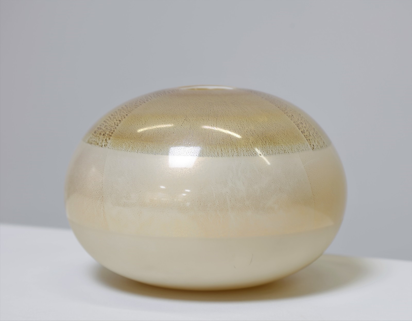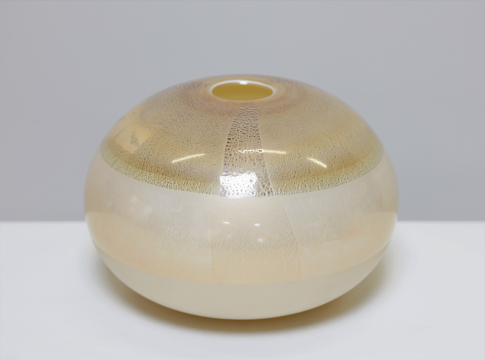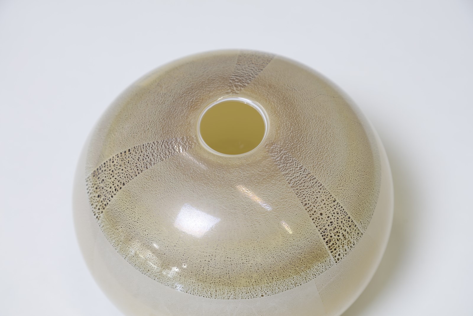 DORDONI RODOLFO Ciotola. Vetro di Murano. Cm 20,00 x 14,00 x 20,00. Vaso per Venini in vetro incamiciato lattimo e applicazioni in foglia oro, firma alla base: "Venini, 2006"