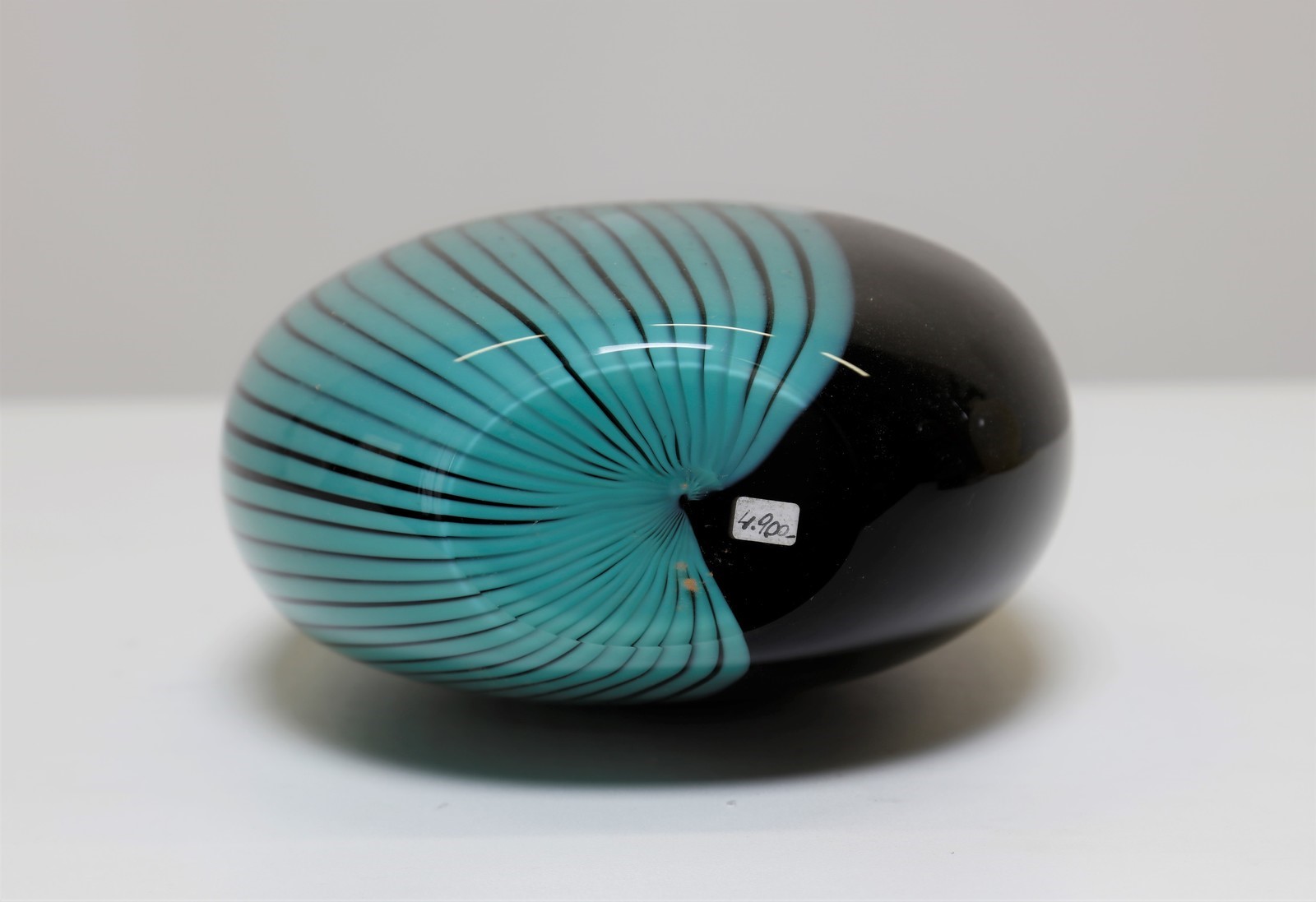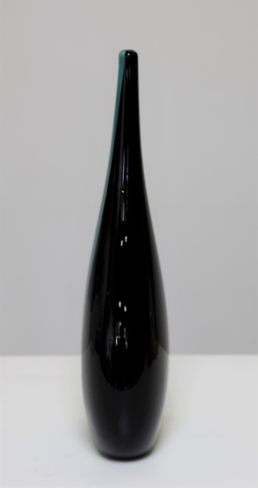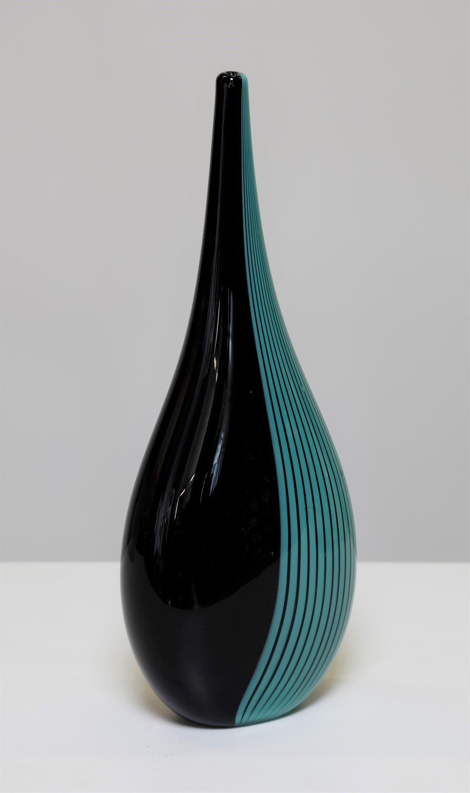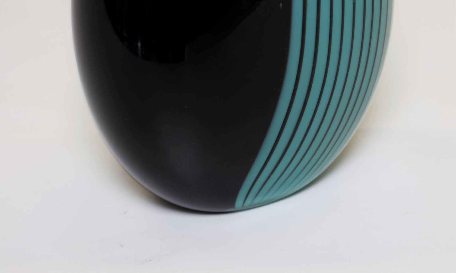 MANIFATTURA MURANO Vaso. Vetro di Murano. Cm 18,00 x 47,00 x 9,00. Vaso in vetro nero e fasce turchesi verticali. Produzione ventesimo secolo.
