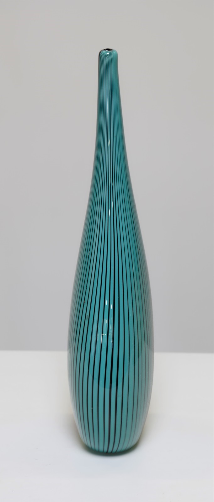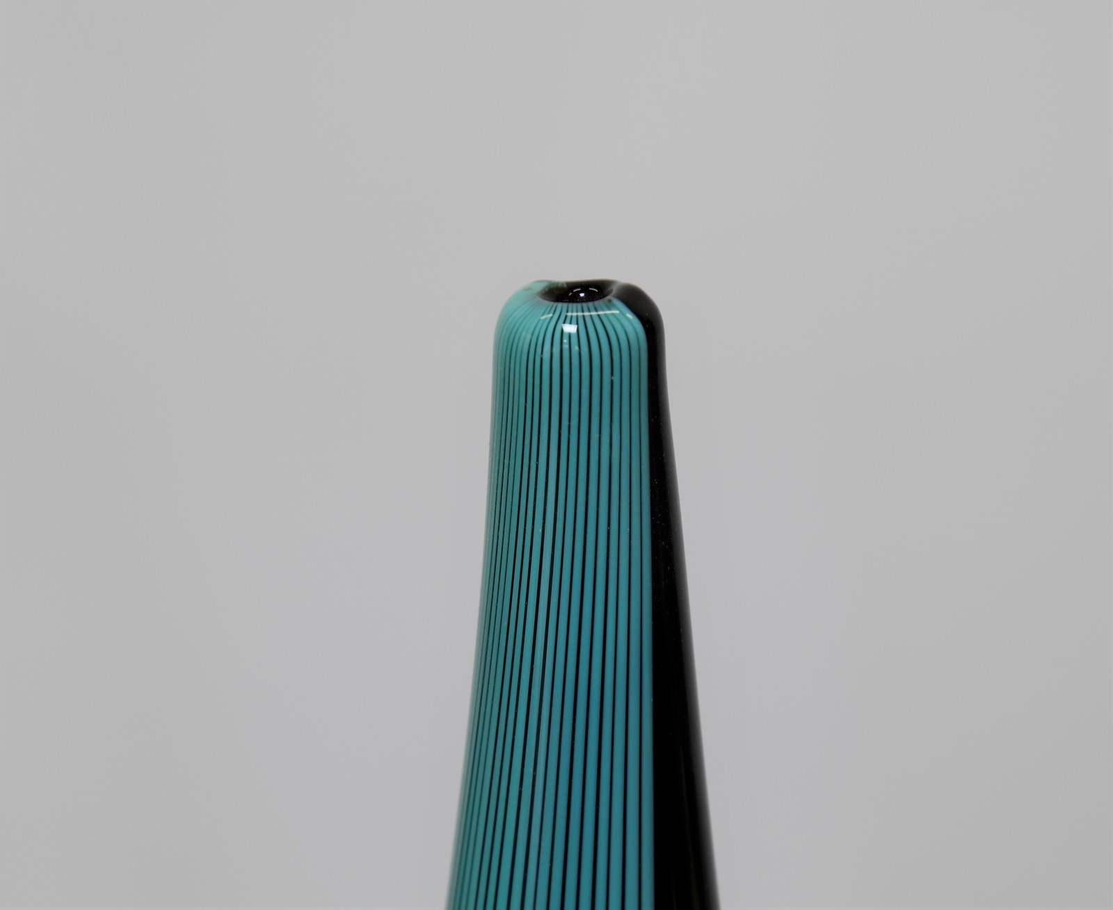 MANIFATTURA MURANO Vase. Murano glass. Cm 18,00 x 47,00 x 9,00. Black glass vase and vertical turquoise bands. Twentieth century production.