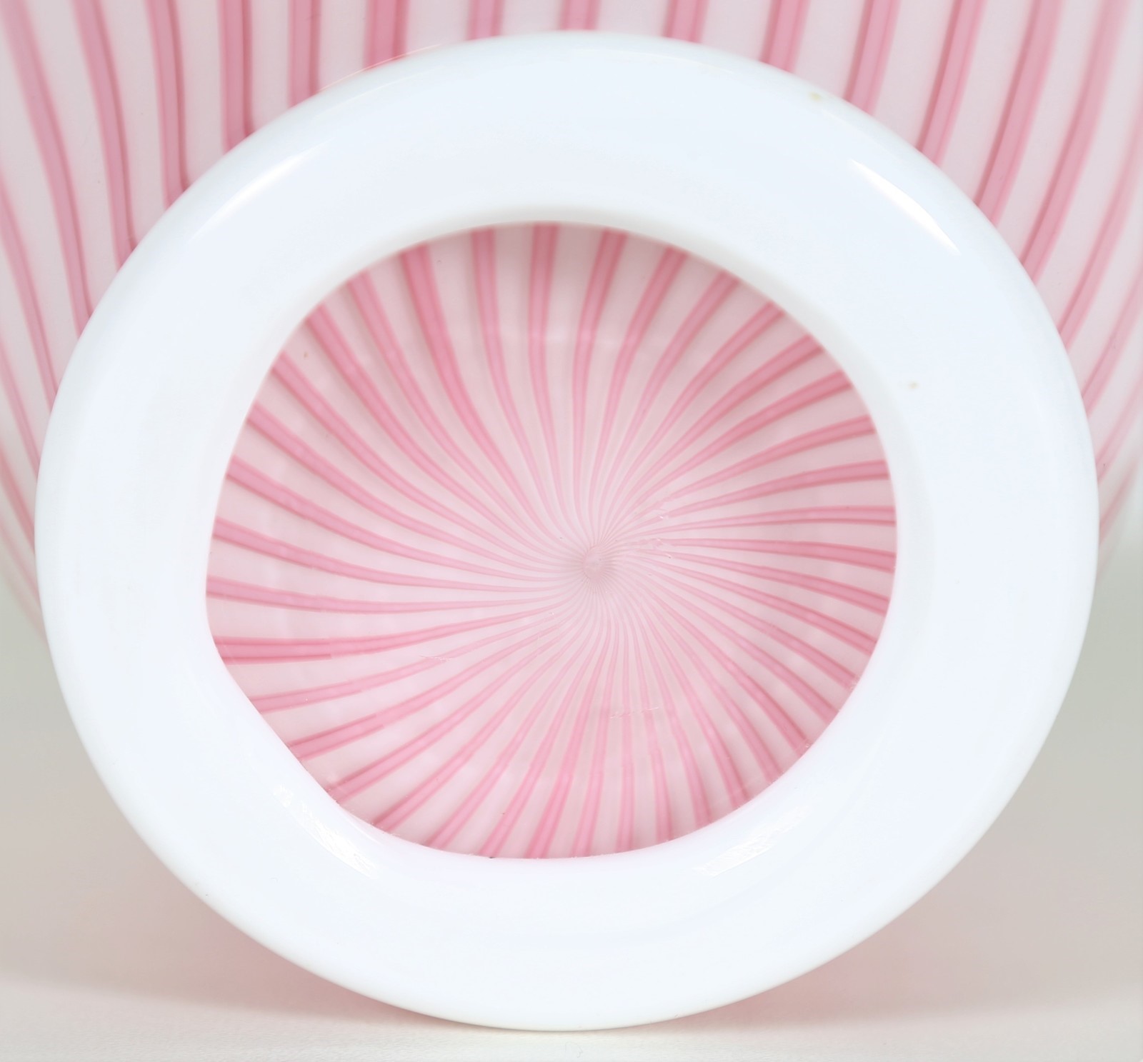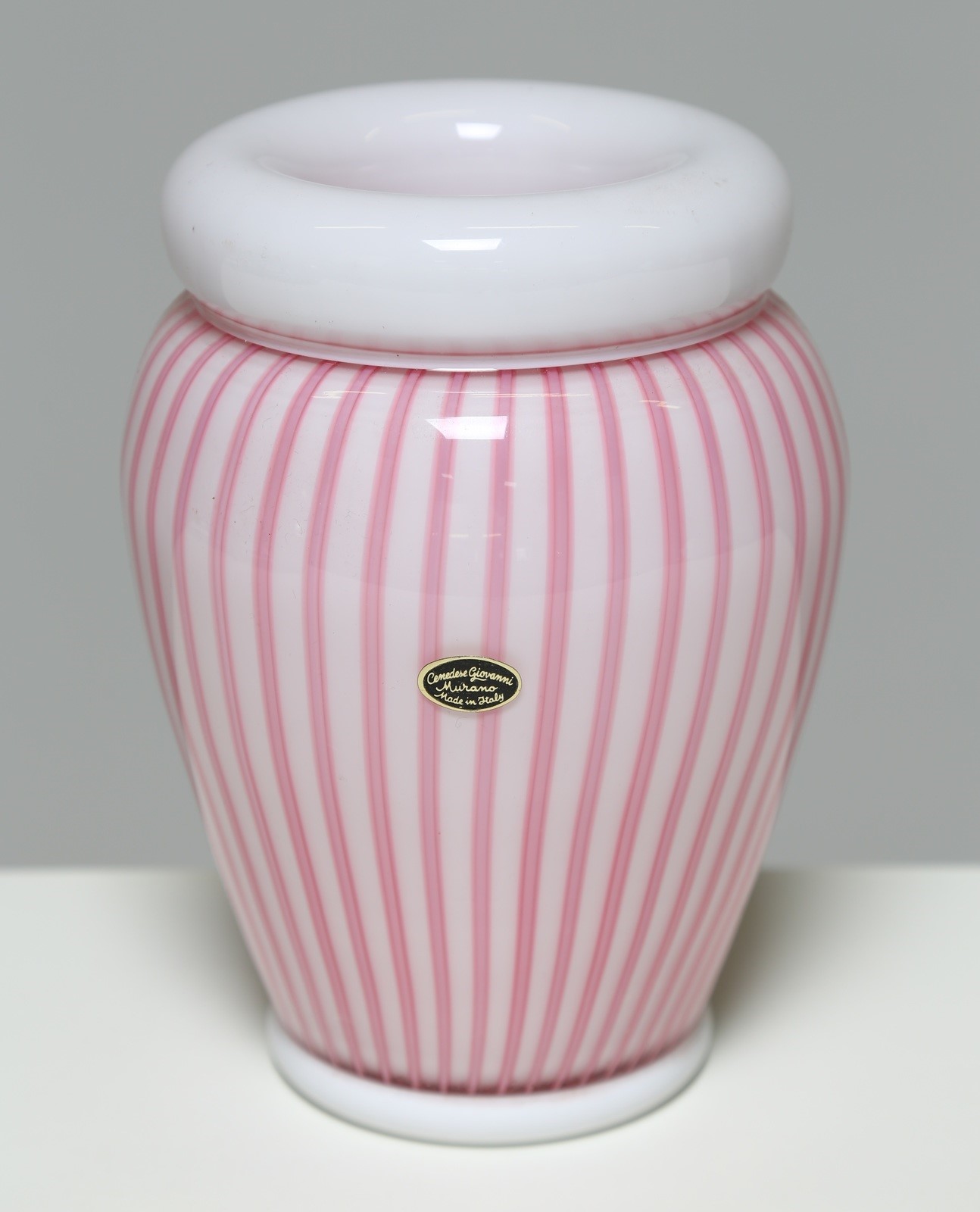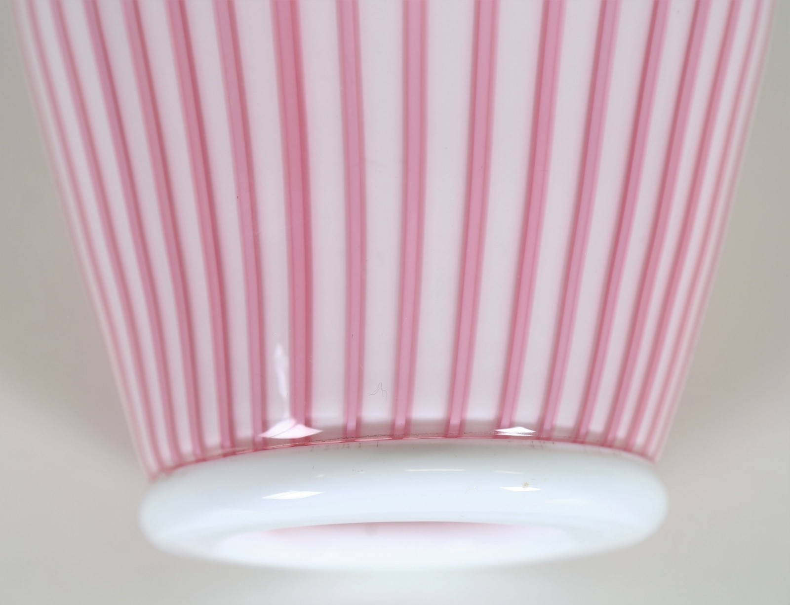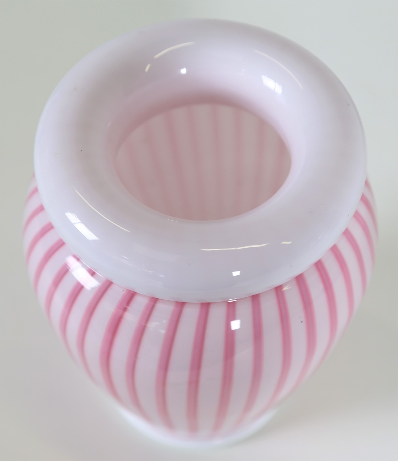 CENEDESE GIOVANNI Vase. Murano glass. Cm 15,00 x 20,00 x 15,00. Milk glass and vertical pink canes, 80s. Label present.