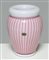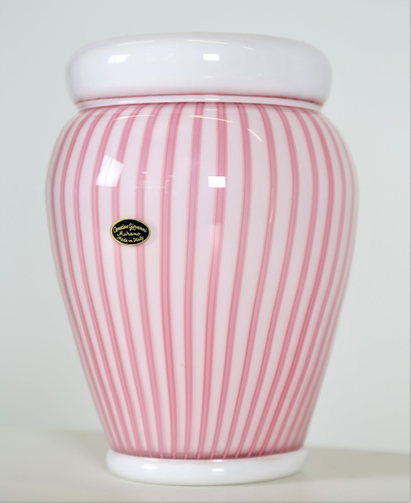 CENEDESE GIOVANNI Vaso. Vetro di Murano. Cm 15,00 x 20,00 x 15,00. Vetro lattimo e canne rosa verticali, anni 80. Etichetta presente.