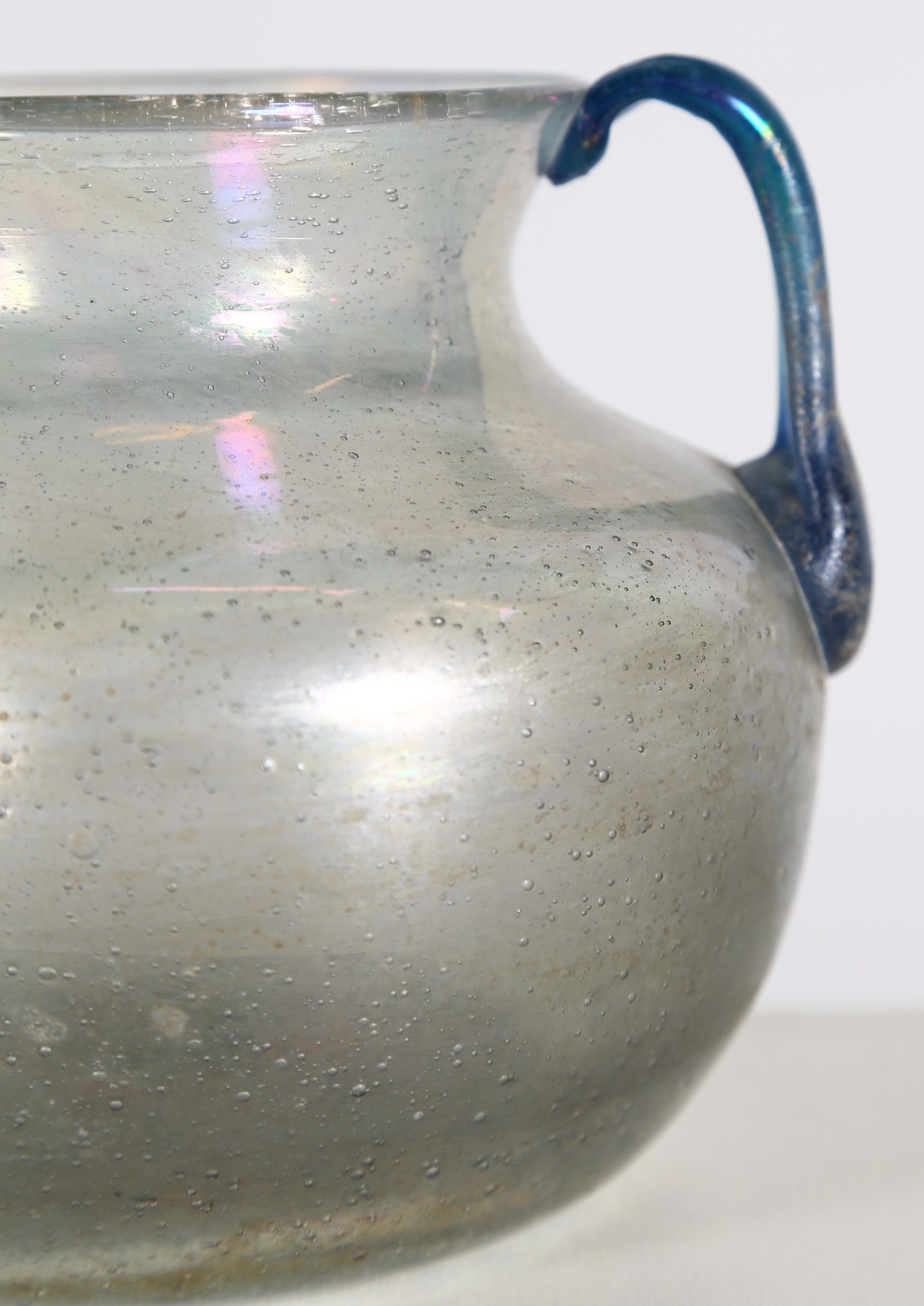 MANIFATTURA MURANO Scavo vase. Murano glass. Cm 14,00 x 11,50 x 13,00. Iridescent gray glass vase with light blue applied handles. 30s