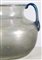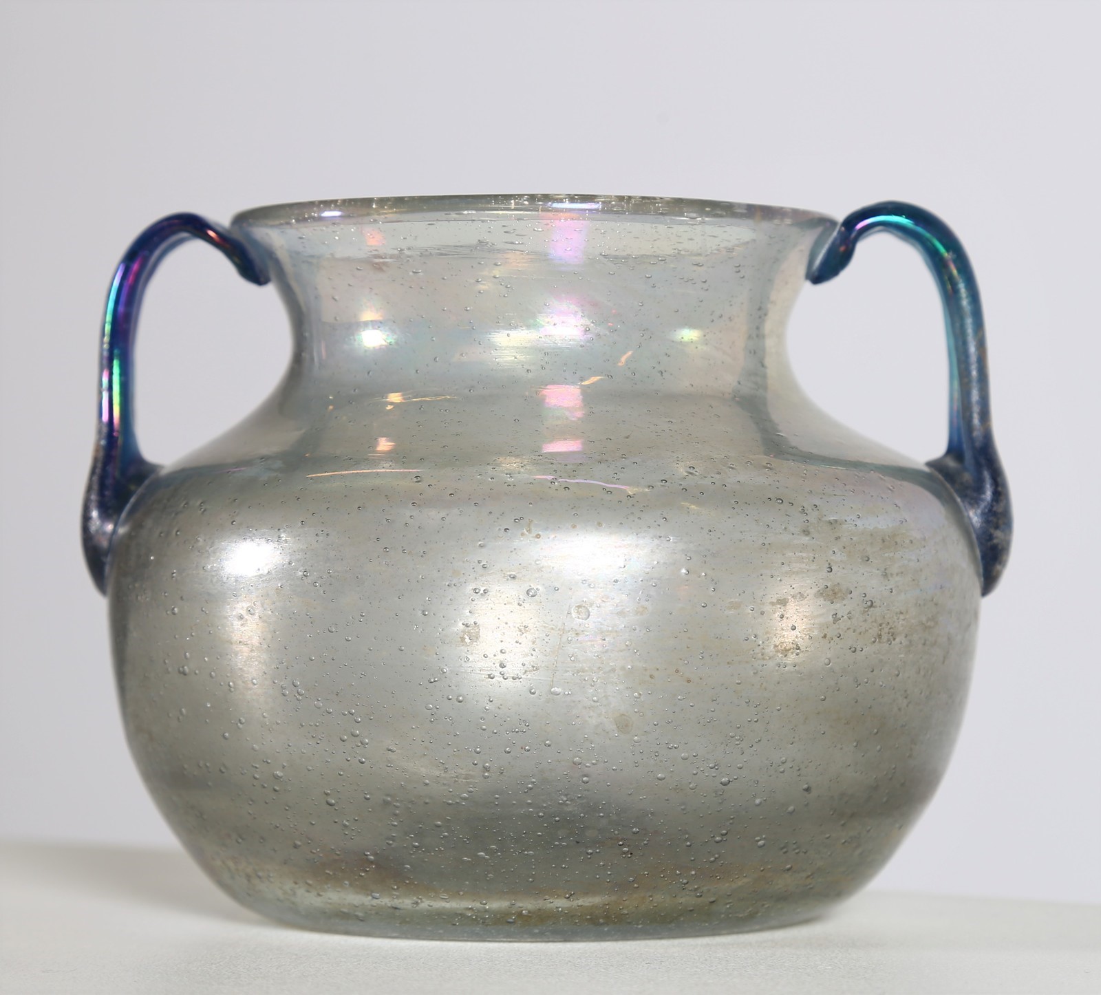 MANIFATTURA MURANO Vaso scavo. Vetro di Murano. Cm 14,00 x 11,50 x 13,00. Vaso in vetro grigio iridescente con anse applicate color celeste. Anni ‘30