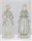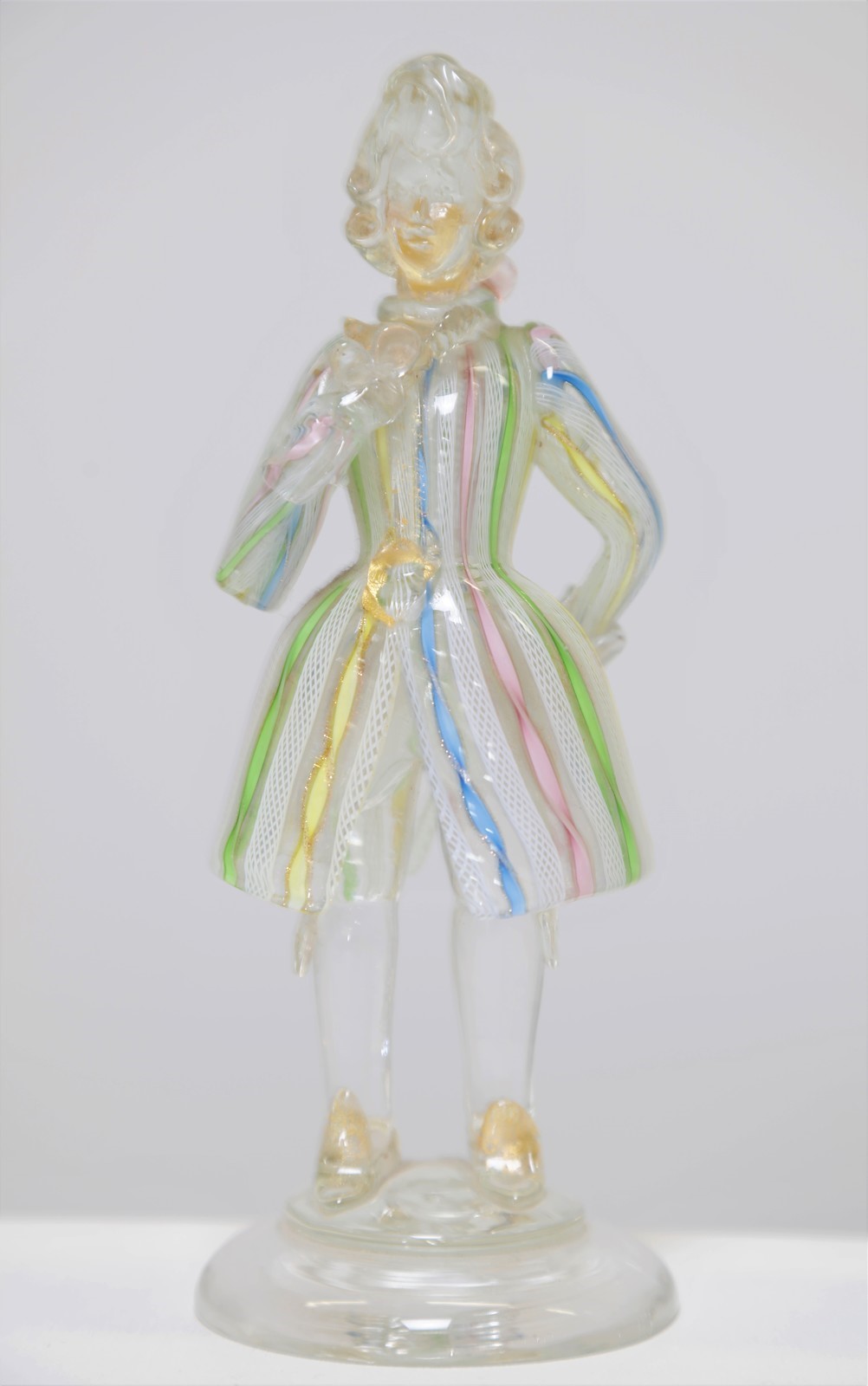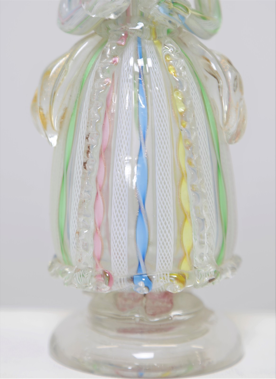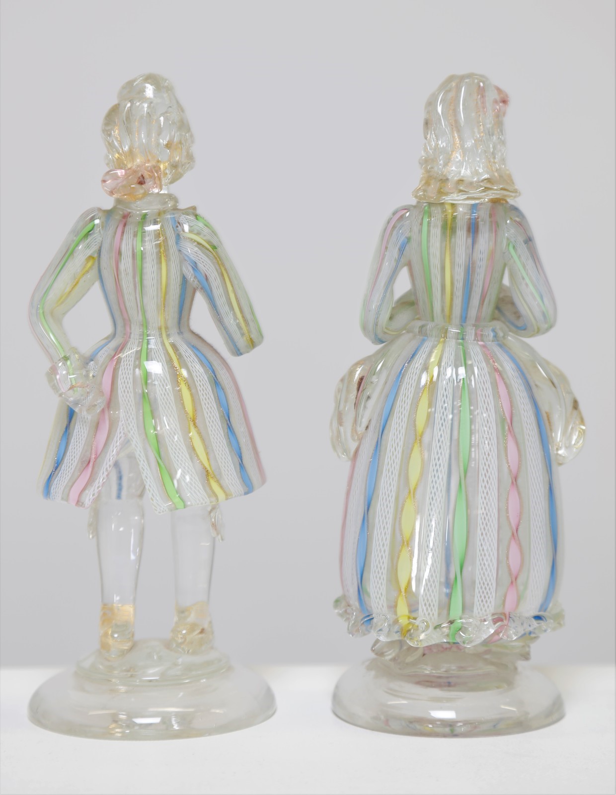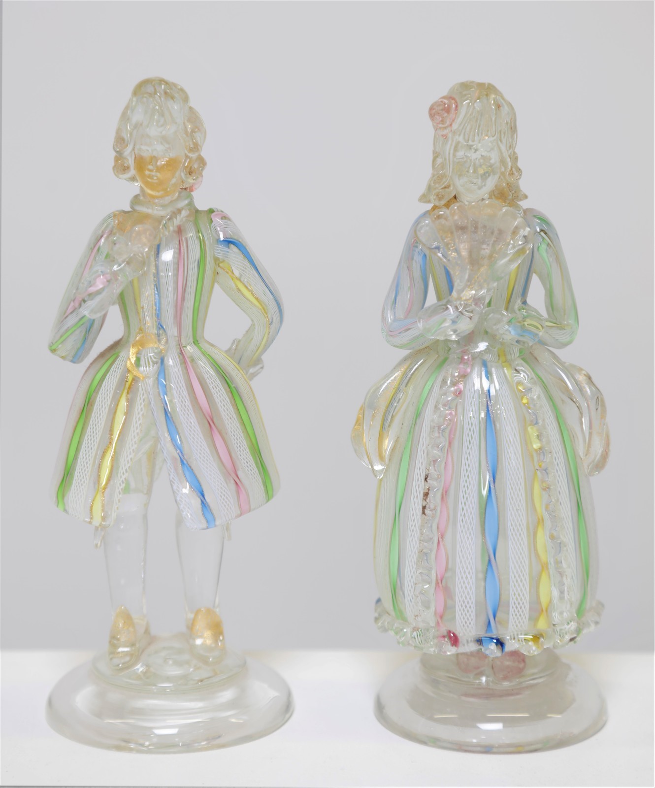 MANIFATTURA MURANO Pair of statuettes. Murano glass. Cm 7,00 x 20,00 x 7,00. Pair of eighteenth-century figurines in glass decorated with colored zanfirici. 60's