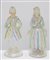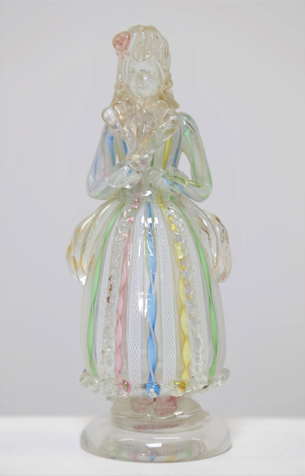 MANIFATTURA MURANO Coppia di statuette. Vetro di Murano. Cm 7,00 x 20,00 x 7,00. Coppia di figurine settecentesche in vetro decorato da zanfirici colorati. Anni ‘60